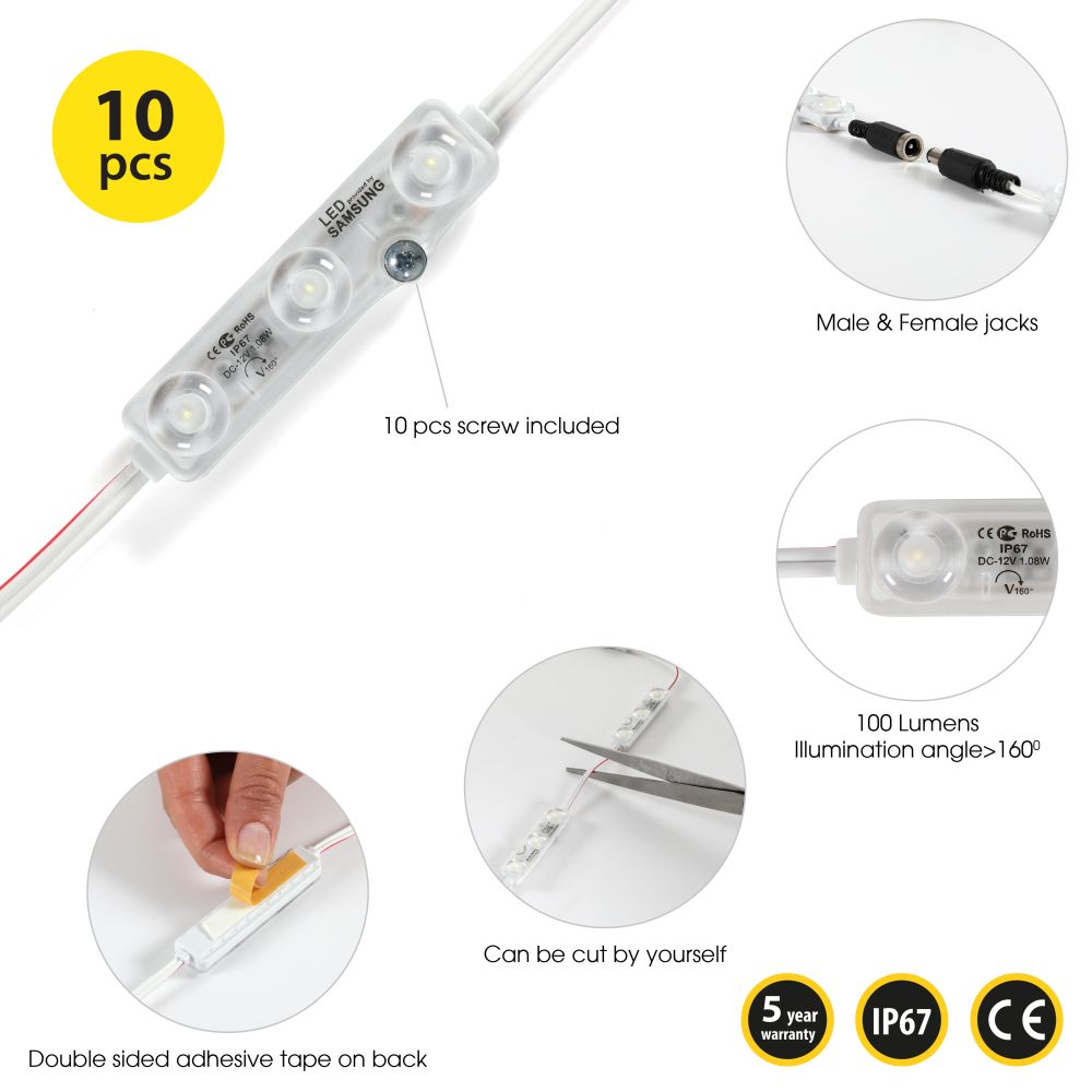 Light output per module is 100 Lumen. These LED light modules can be used with dimmers and other on-off switches. One module needs 1.1W power, you can power this LED module string with a 12V 12W DC or stronger power supply. Every 3 LED module is cuttable from the cable without damaging the rest of the strip.This SMD LED string is IP67 waterproof. 2835 chip module with a 160-degree lens to increase luminous intensity. High quality, super-bright, energy-saving and environmentally friendly, high brightness, low heat generating, no UV or IR light radiation, impact resistance, Long lifespan 50,000+ hours. Ideal for decorative and billboard back lighting.Suitable for indoor and outdoor use. It can be used in advertisement illumination like letter signs and backlight for billboards. You can use these LED module strip lights for DIY home, garden or party decoration, to illuminate your closet or drawer, to create authentic scenery on the kitchen counter, under the table, or bed. You can turn a standard make-up mirror like Hollywood style vanity make-up setup.