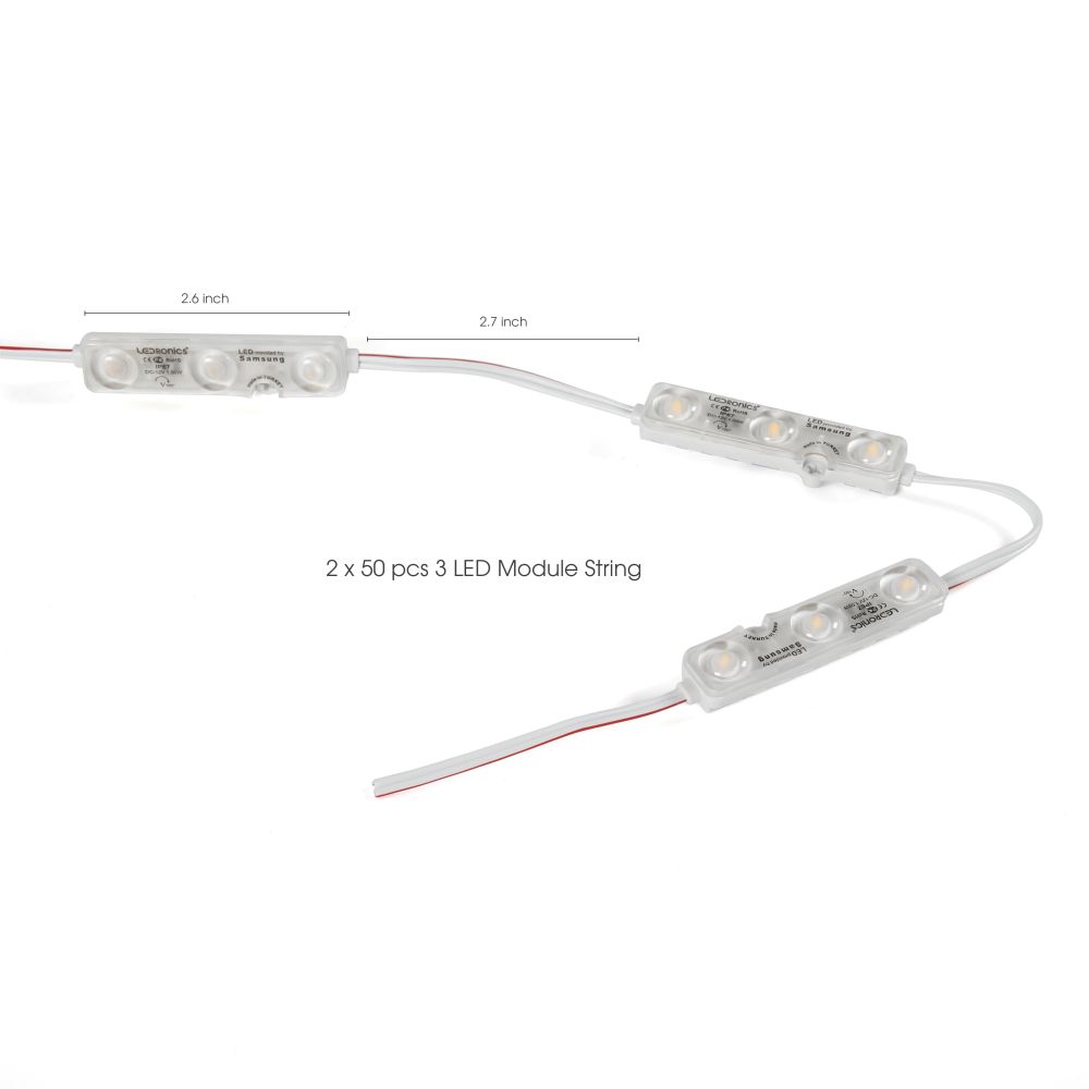 Introducing our high-quality LED module set, perfect for your lighting needs. Each module features 3 bright LEDs, ensuring optimal illumination. The package includes 2 sets of 50 modules, totaling 300 LEDs, providing ample lighting for any project. Designed for easy installation, each module comes with adhesive tape on the back and screws for a secure setup. The modules are assembled into a 45-foot (13.7-meter) string, offering flexibility and convenience from end to end. Ready for soldering, this LED module set is ideal for both DIY enthusiasts and professional installations. Enhance your space with this reliable and efficient lighting solution.