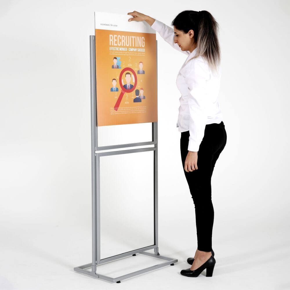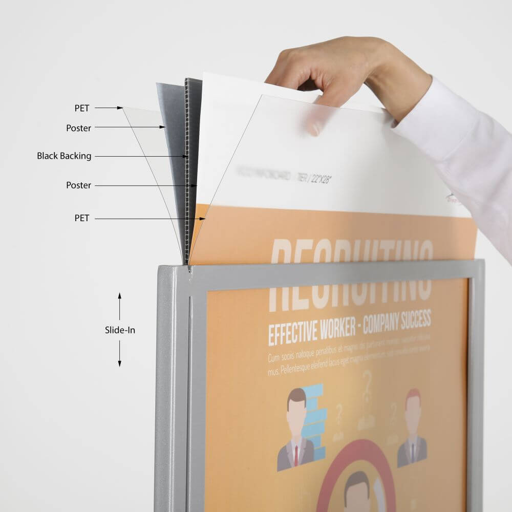 The use of this Slide-In info board is fairly easy and it is Double-Sided. You can load 2 signs back to back, visible on both sides. To load or change a graphic, Remove the backing with the anti-glare PETs. Position the poster between the backing and the PETs, slide the backing in. It allows a clear view of the print, poster and protects the artwork from dust and direct light.Suitable for indoor use. It is made of the finest materials while providing the highest level of quality. It has a sturdy cast iron profile with an anti-corrosive coating. The coating protects the frame from dust and light scratches.Having a stylish and simple appearance, large and eye-catching visual size, is the best information display stand for star hotels, restaurants, exhibitions, and other places. It suits every decoration in offices, restaurants, cafes, boutiques, bookstores, bakeries, and many more. You can effortlessly display your poster, advertisement, and even your menu at your business.