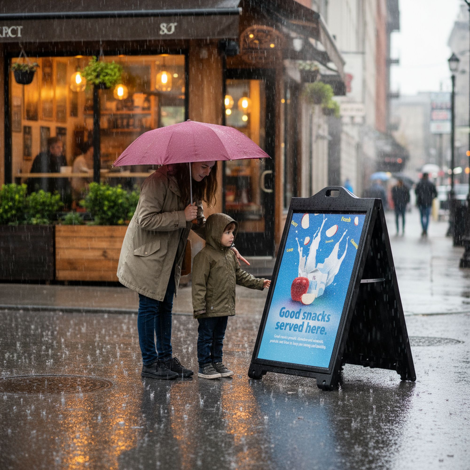 Made of weather-resistant HDPE (high-density polyethylene), which makes it ideal for outdoor use. The durable and heavy design keeps your signage stable without needing to fill with water or sand, unlike other plastic A-Frame sidewalk signs.