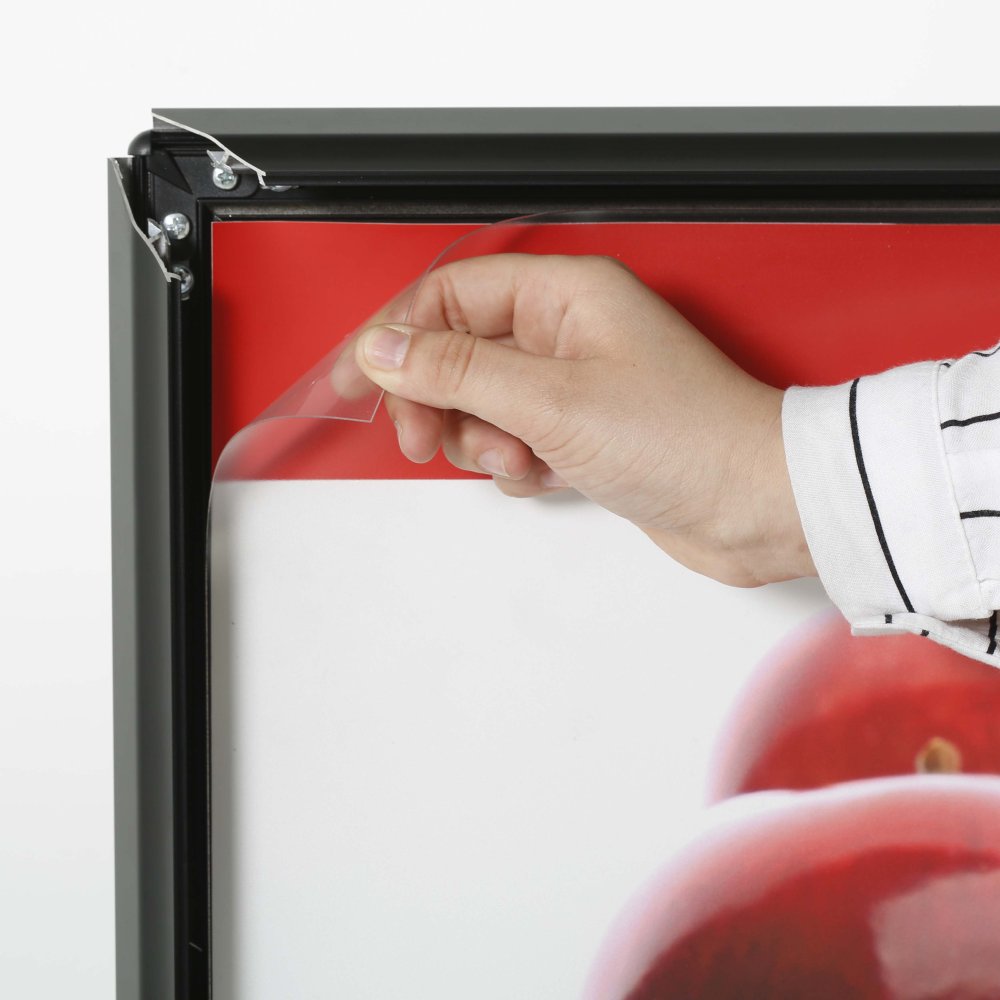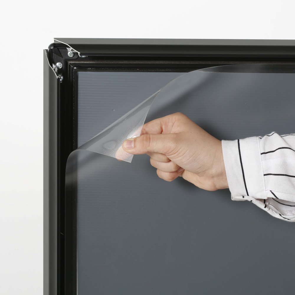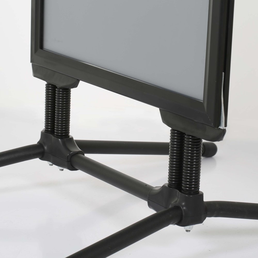 This matte black outdoor display with an aluminum construction is very suitable for mild weather conditions to use outside of restaurants, retail stores, shopping centers, theaters and night clubs.Its distinctive design will elegantly emphasizes your upcoming events, deals, promotions or messages you want to give.It is formed of two rugged springs which are connected to the heavy-duty base, providing flexibility.These heavy long feet provide stability, which is a very important feature for a pavement sign for safety reasons.The black metal snap frame allows you to insert and remove your 30" x 40" printed graphics just in a few minutes easily.This double-sided sidewalk display comes with non-glare lenses to protect your posters.It is shipped unassembled.don't worry, it is very easy to assemble.This outdoor sidewalk has double sided snap frame, snap frames are easy to use.Simply flip up the four sides and place in your poster required under the anti glare overlay.Anti glare protective overlay is a weather resistant film, protecting the poster from dust and damage.Suitable to use in outdoor conditions in front shops and very common in gas stations.The water wick surronding the interior of the frame protects the posters from rain outdoors.Round safe corners guarantee maximum safety on the pavement.