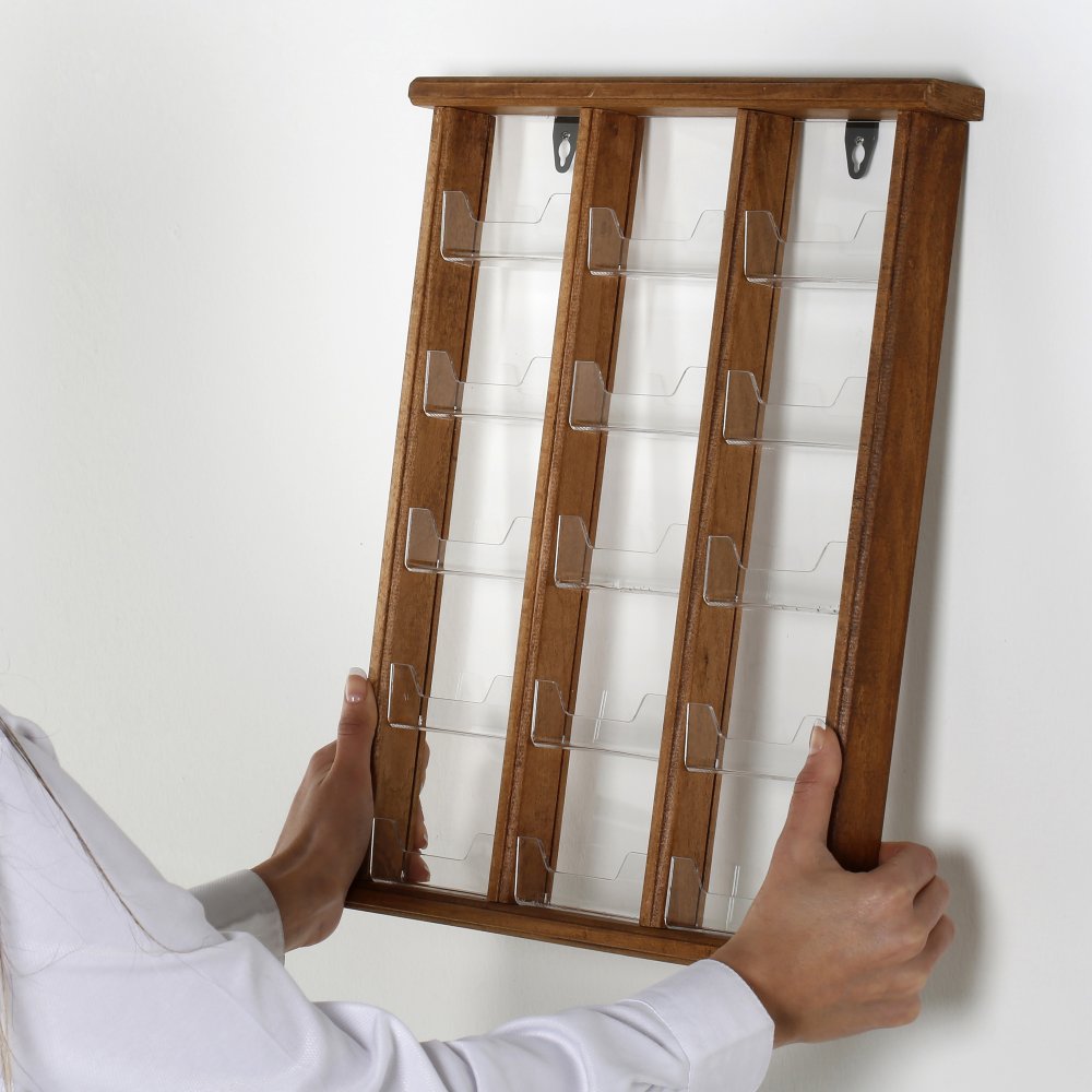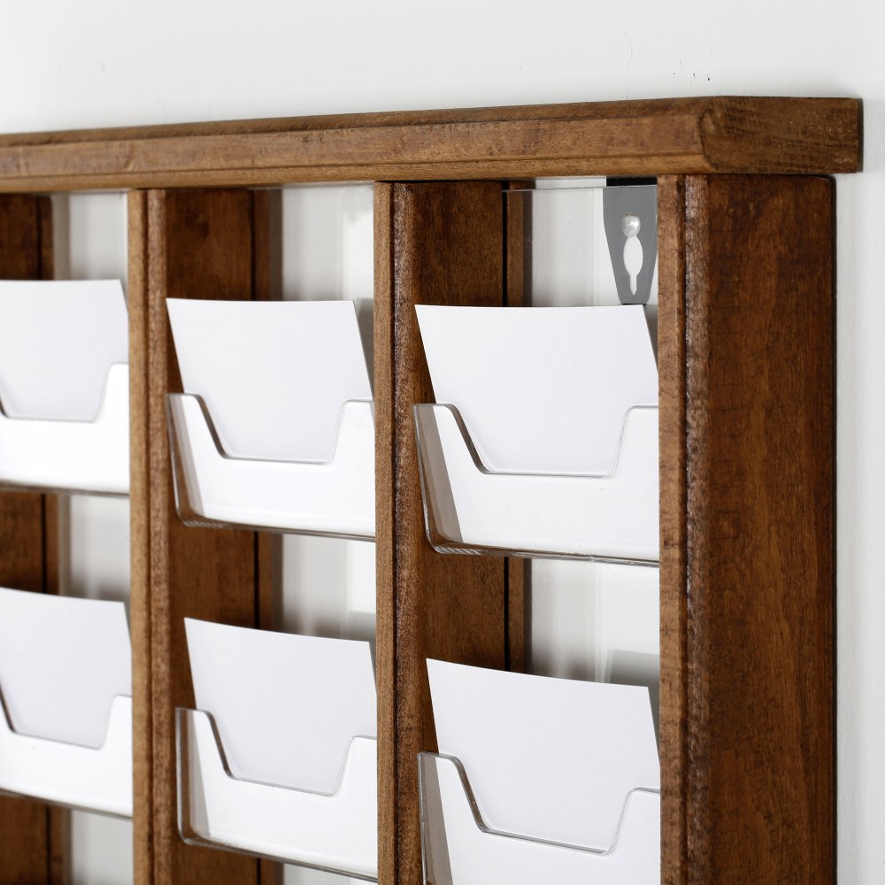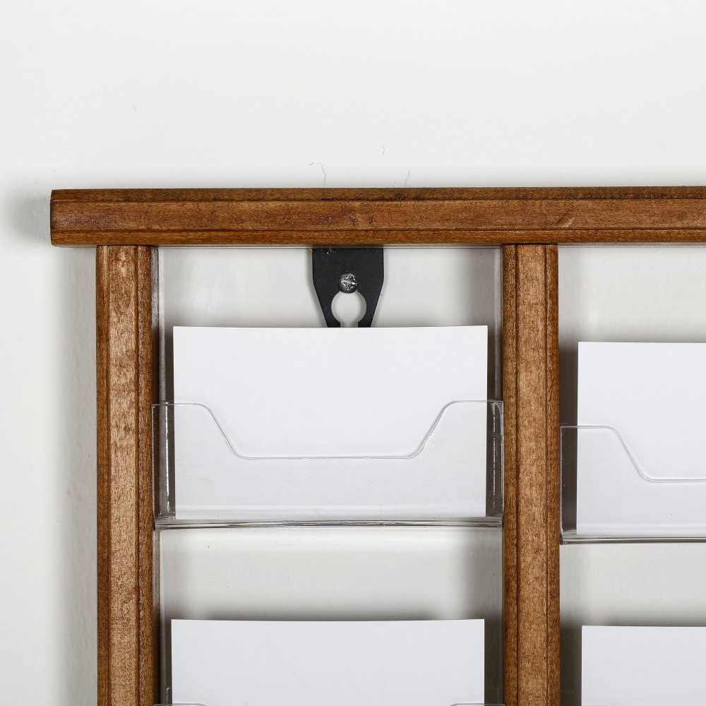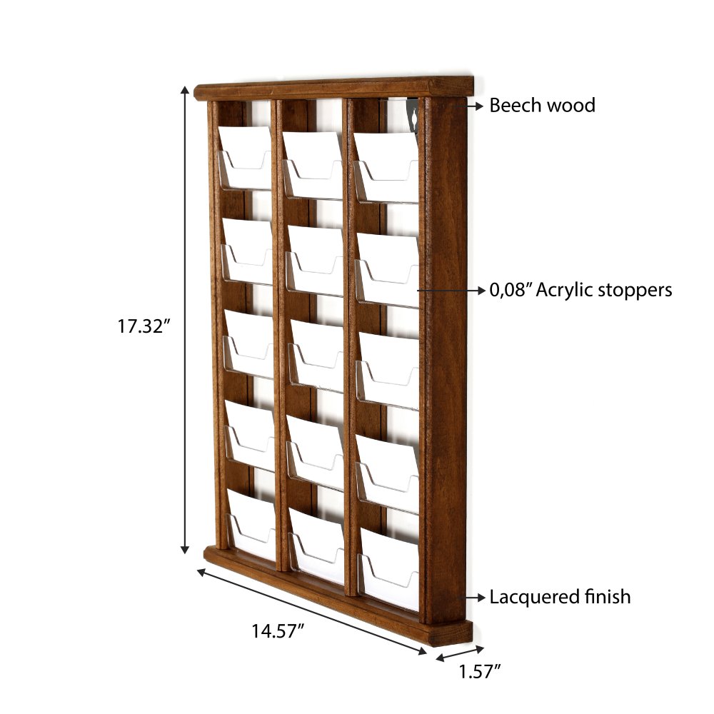 Enhance your organizational space with our Dark Wood Wall Mount Wooden Card Holder, expertly crafted to store and display information packages in one convenient location. Constructed from high-quality, lacquered dark wood, this card holder exudes elegance and durability. The clear acrylic pockets offer a full view of stored flyers or brochures, ensuring easy access and visibility. Designed with tiered pockets stacked vertically, it maximizes space efficiency, making it ideal for offices, banks, schools, hospitals, hotels, and more. Each pocket features inner dimensions of 3.54″ x 0.72″ x 3.07″, perfectly accommodating standard-sized cards and brochures. Elevate your organizational needs with this stylish and functional wall-mounted card holder.
