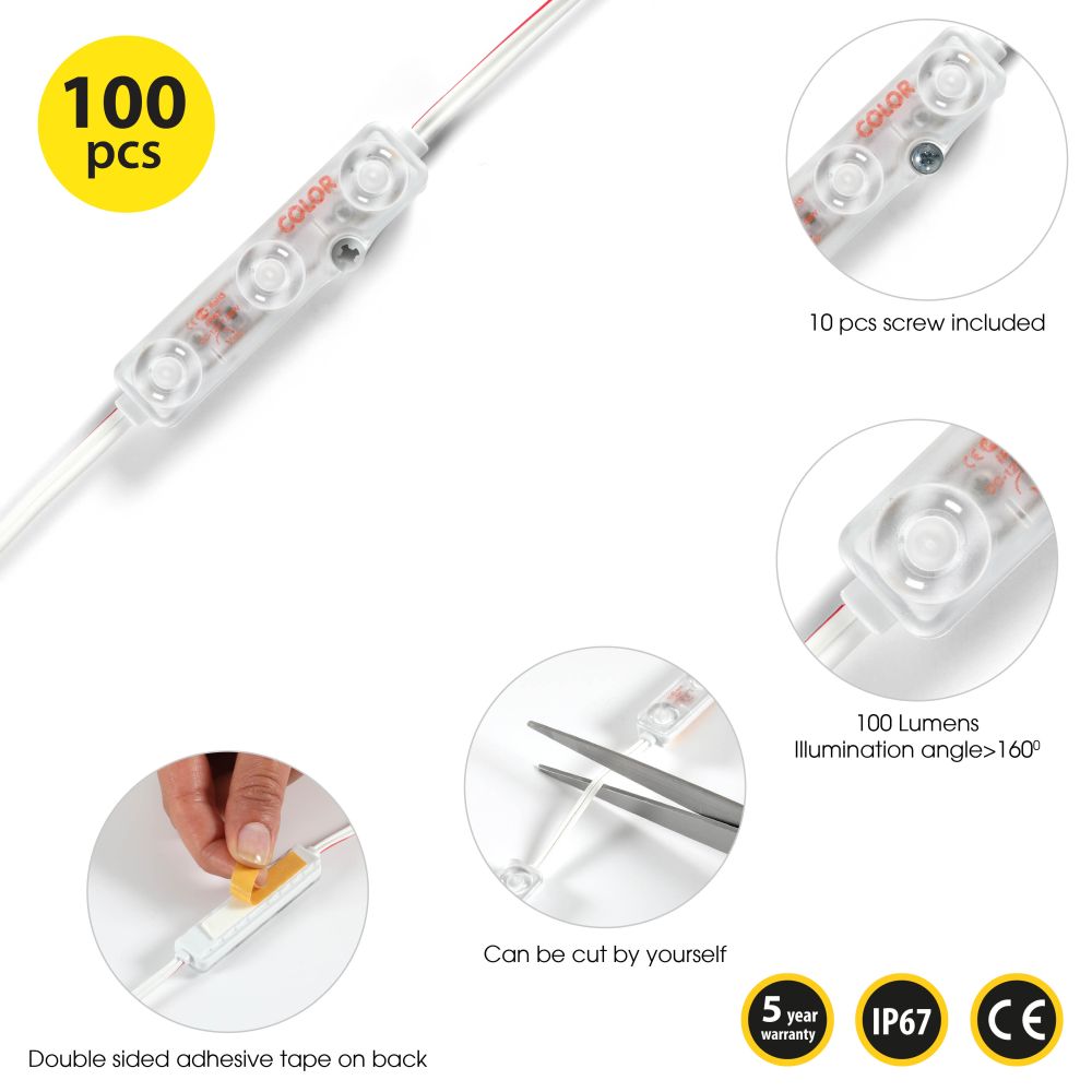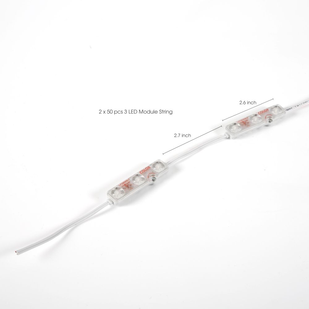 Introducing our high-quality LED module set, perfect for your lighting needs. Each module features 3 bright LEDs, ensuring optimal illumination. The package includes 2 sets of 50 modules, totaling 300 LEDs, providing ample lighting for any project. Designed for easy installation, each module comes with adhesive tape on the back and screws for a secure setup. The modules are assembled into a 45-foot (13.7-meter) string, offering flexibility and convenience from end to end. Ready for soldering, this LED module set is ideal for both DIY enthusiasts and professional installations. Enhance your space with this reliable and efficient lighting solution.