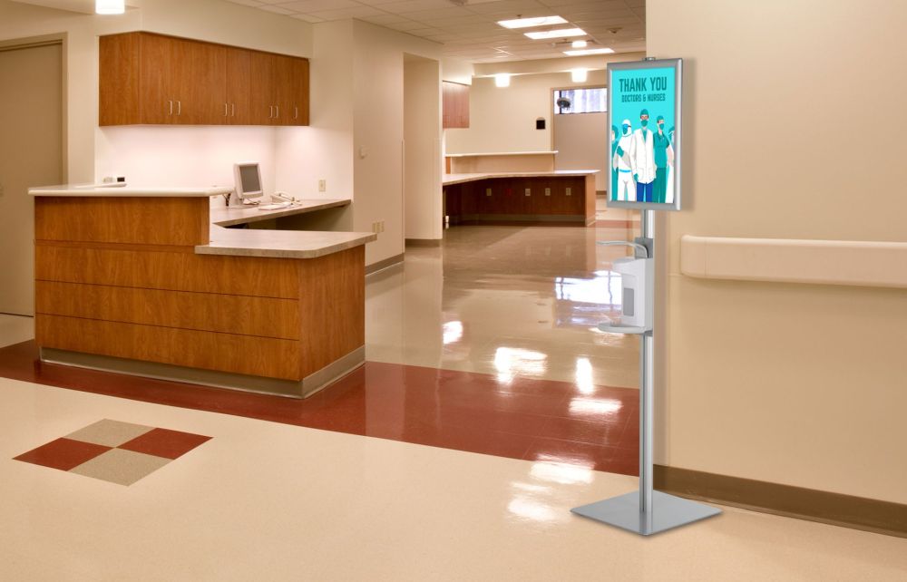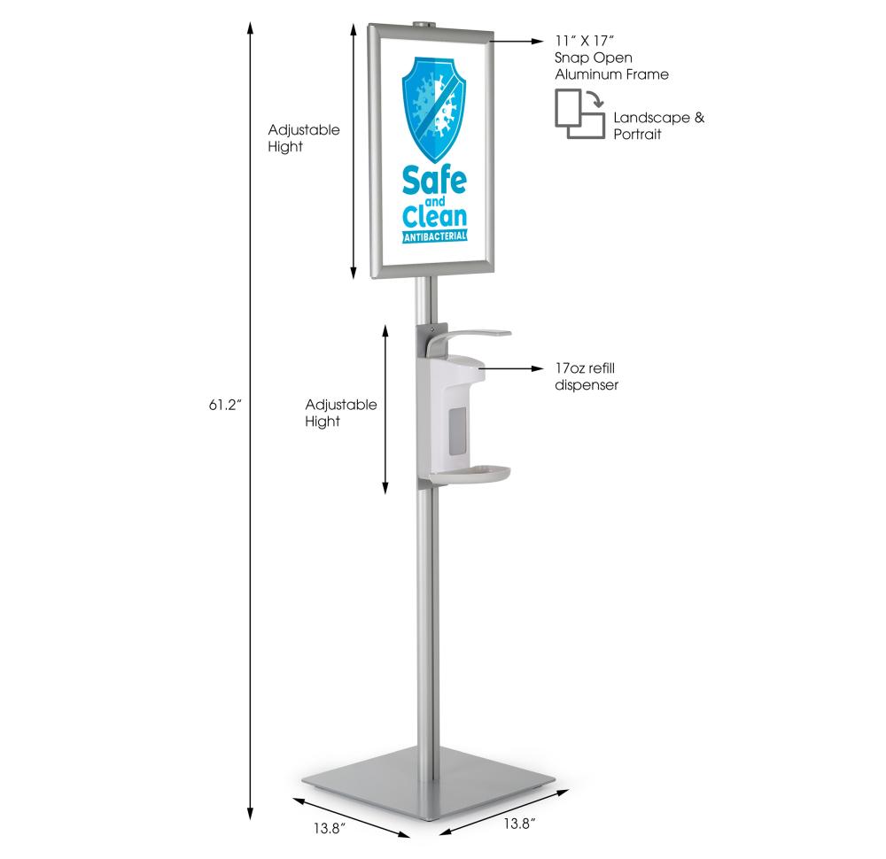 Adjustable Hand Sanitizer Floor Stand with 11×17 Inch Opti Snap Frame – 500 mL (16.9 oz.) Dispenser