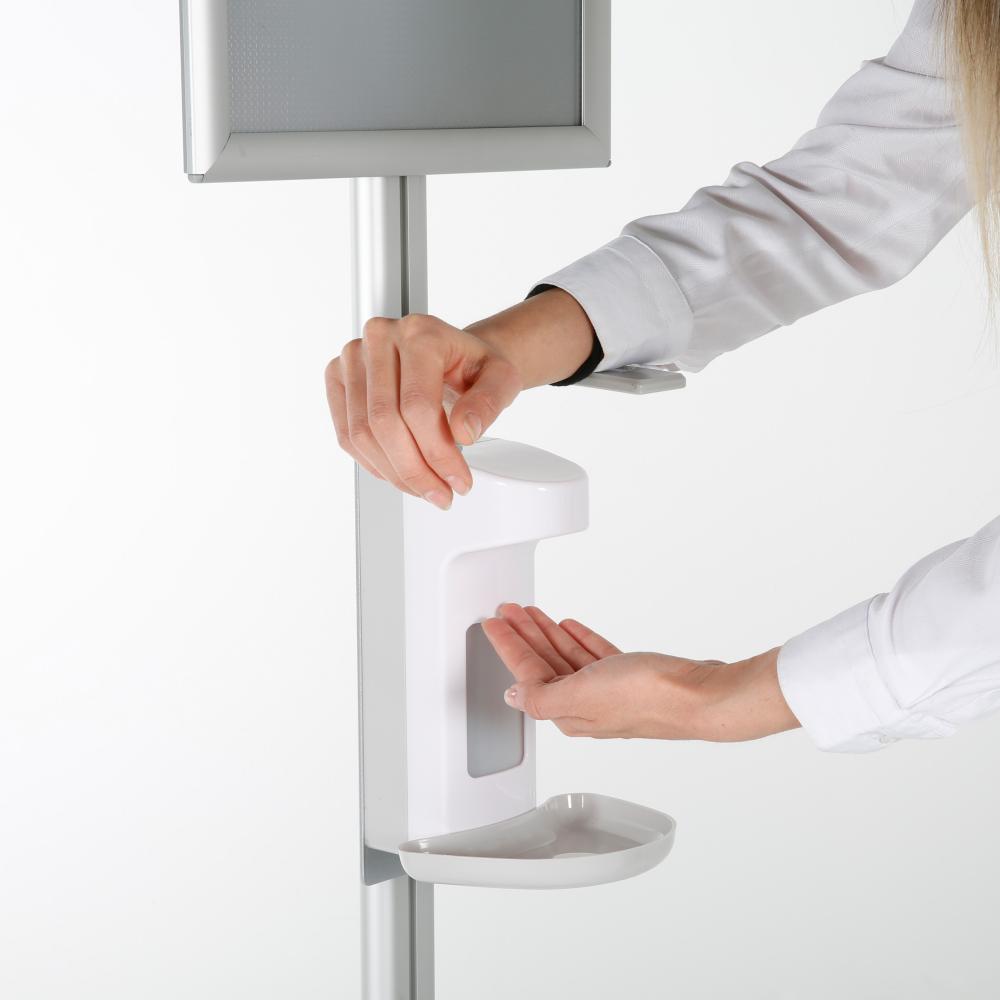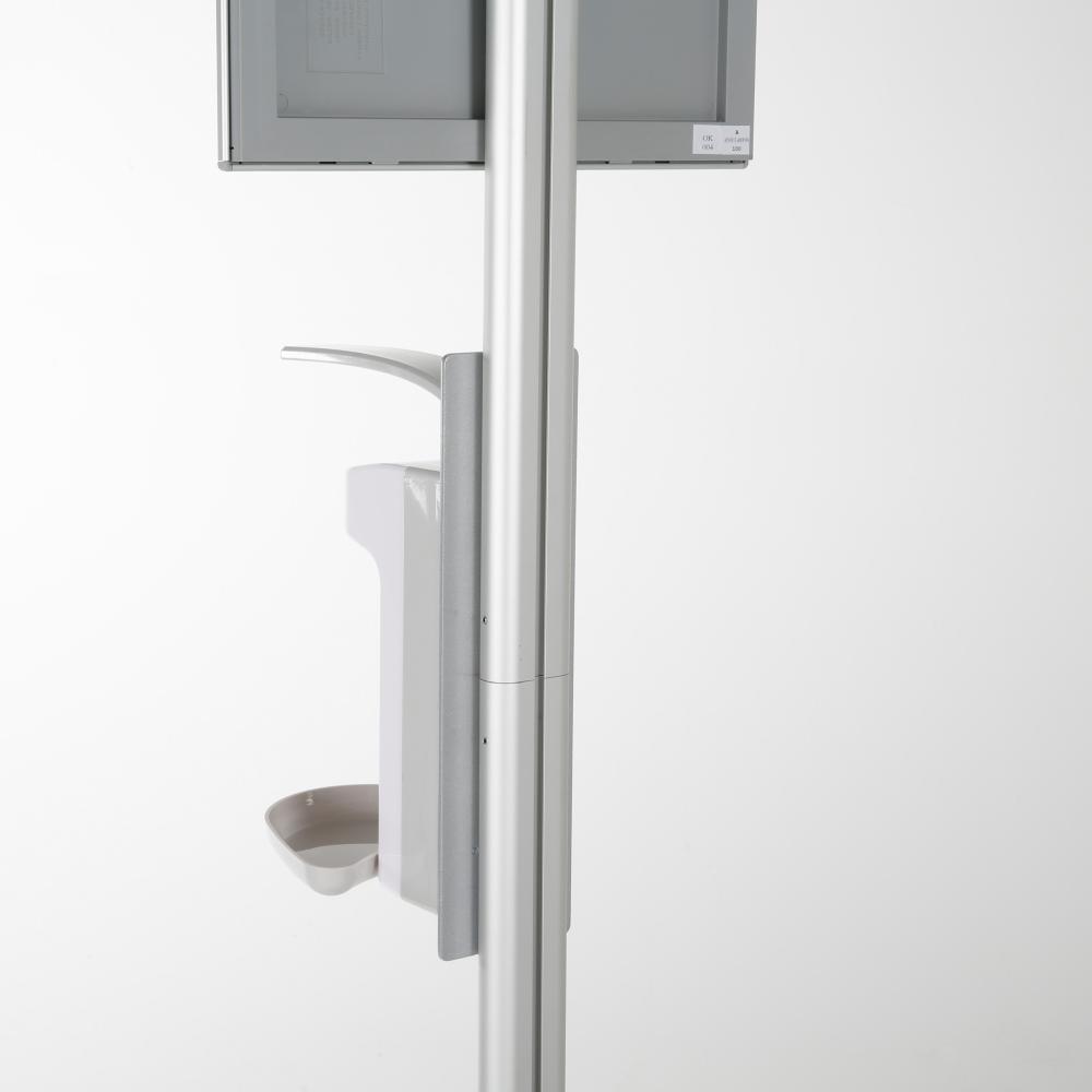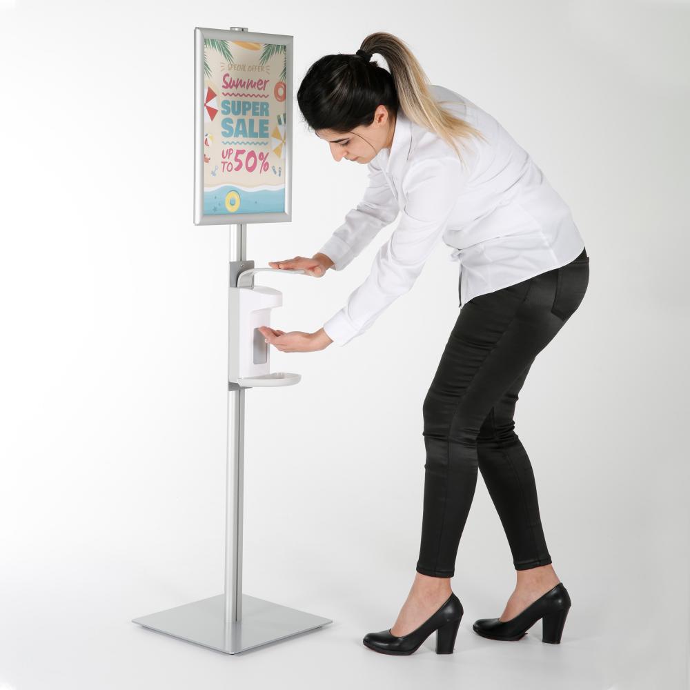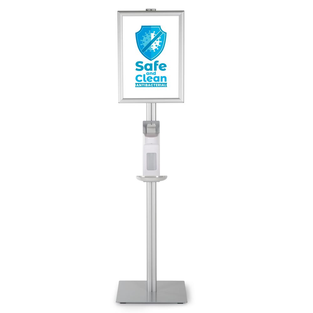 Enhance your hygiene protocols with our Free Standing Sanitizer Dispenser, designed to provide easy access to sanitizing products and safeguard your customers and employees from harmful viruses, bacteria, and germs. This mobile sanitizing station features a free-standing post, allowing you to conveniently relocate it as needed. Its sturdy, heavy base ensures stability, while the adjustable dispenser height accommodates various user preferences. Please note that sanitizing gel is not included. Additionally, the front-loading snap frame supports 11x17 inch (A3) advertisements, posters, or signs, making it perfect for promotional displays. Ideal for high-traffic areas, this versatile dispenser is a must-have for maintaining a clean and safe environment.