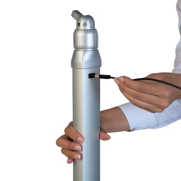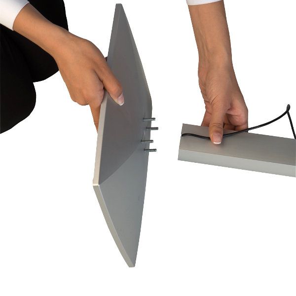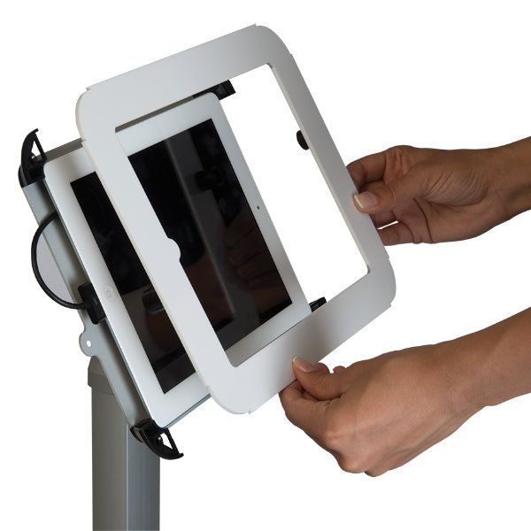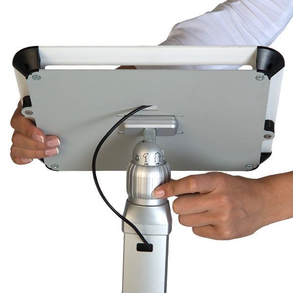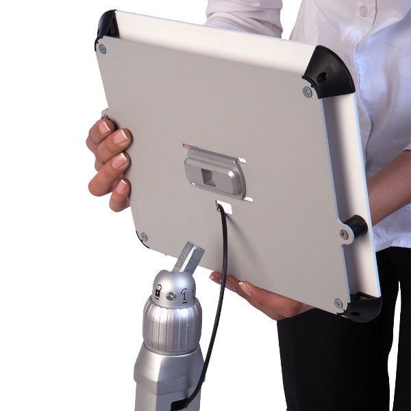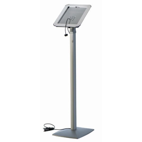 The stand is adjustable to a maximum height of 48 1/16 inches (1220 mm) in landscape mode and 49 1/16 inches (1245 mm) in portrait mode, ensuring optimal viewing angles. For added stability, the foot plate secures your iPad with two tamper-proof screws, protecting against theft and accidental falls. The package includes an Allen key for easy assembly and secure locking of this floor stand kiosk.