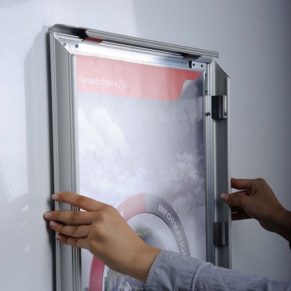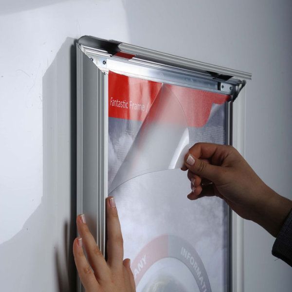 Introducing the Fancy Frame, a versatile and stylish framing solution designed to make changing graphics effortless. This innovative snap-open frame system is perfect for advertisers and decorators seeking a decorative touch. Available in various sizes, these frames are ideal for enhancing the visual appeal of picture displays in commercial settings.