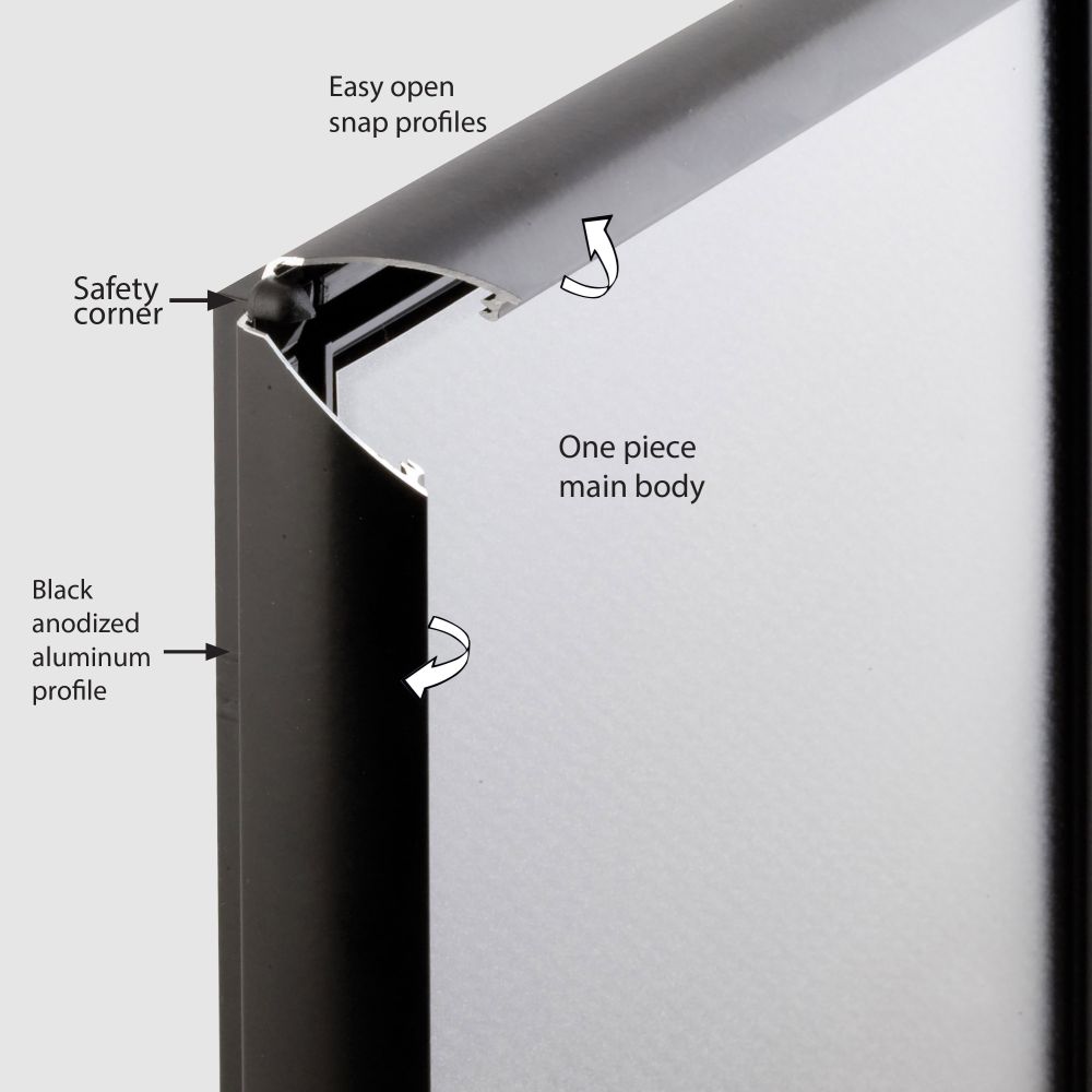 The use of this aluminum frame is fairly easy. To load or change a graphic, simply snap open the four spring-loaded frame edges, remove the anti-glare transparent cover and place graphic, picture, photo, poster and or artwork as required, then snap close the frame edges. The anti-glare cover allows a clear view of the print, poster and protects the artwork from dust and direct light.It is made of the finest materials while providing the highest level of quality. The aluminum profile makes the product durable yet light to carry easily. Anodized finish will protect the frame from dust and light scratches. Anti-glare cover protects your poster from getting dirt, dust and damage yet prevents glaring for a better and clear view.Suitable for indoor use. It can be used in portrait or landscape position. An excellent way to get attention when you want to display pictures, photos, posters, documents or certificates, marketing advertisements, promotions and important messages. It can be used in a multipurpose setting, whether this may be at your place of business, office, markets, cafes, restaurants, shopping centers, cinemas, cafes, theaters, hospitals or more.