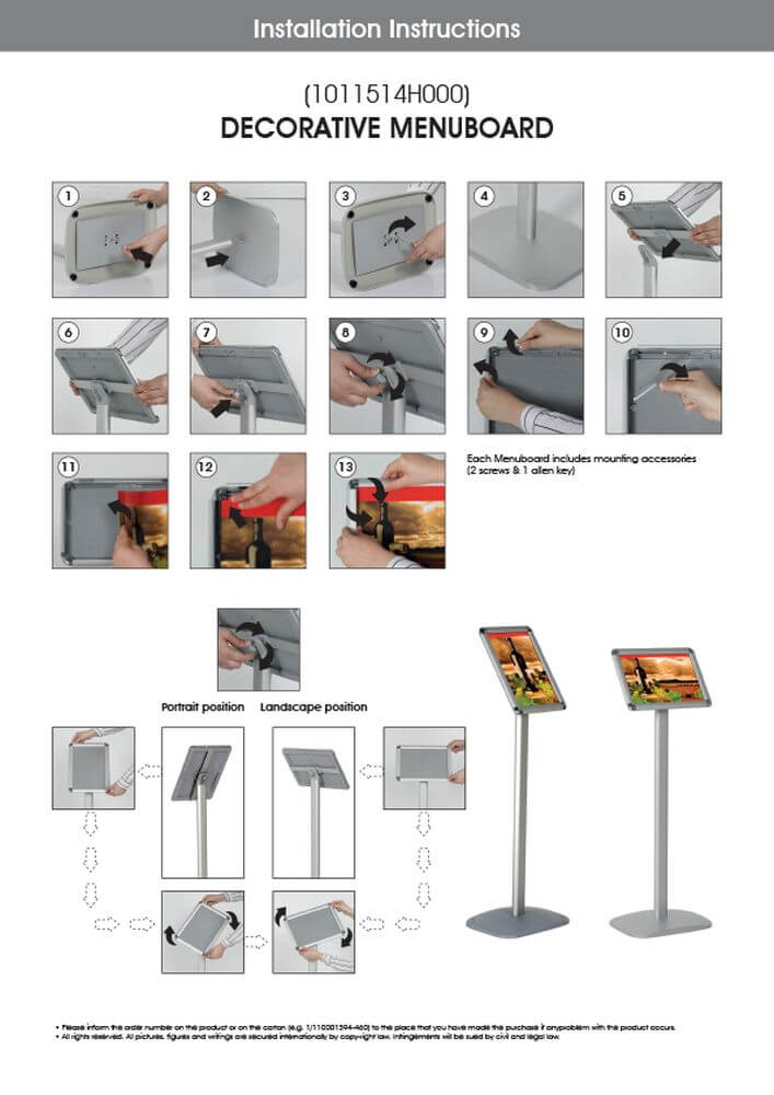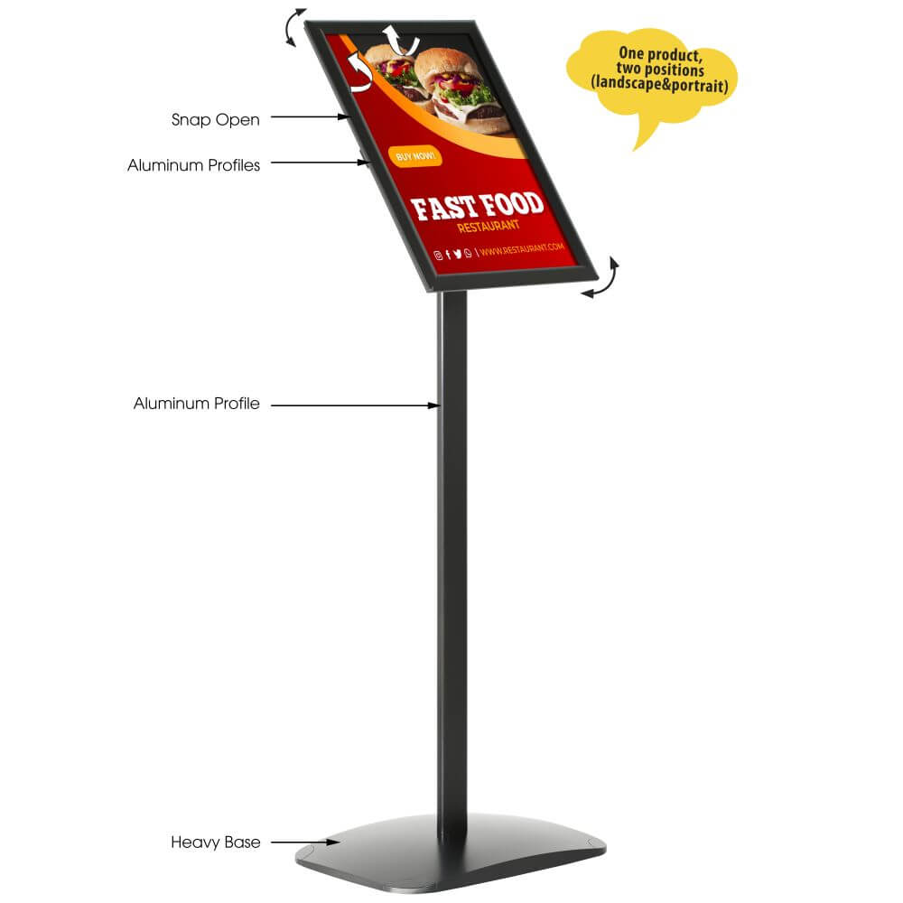 Enhance your business communication with this elegant freestanding signpost, designed to effectively reach both customers and employees. Crafted with a durable aluminum body and frame, this signpost exudes a professional and sophisticated appearance. Its convenient front-loading mechanism allows for effortless media changes, ensuring your messages are always up-to-date. The signpost is shipped unassembled, but assembly is a breeze with the included photo-oriented, easy-to-understand instruction manual. Perfect for any business setting, this versatile signpost combines practicality with style, making it an essential addition to your marketing toolkit.