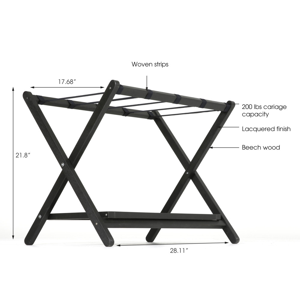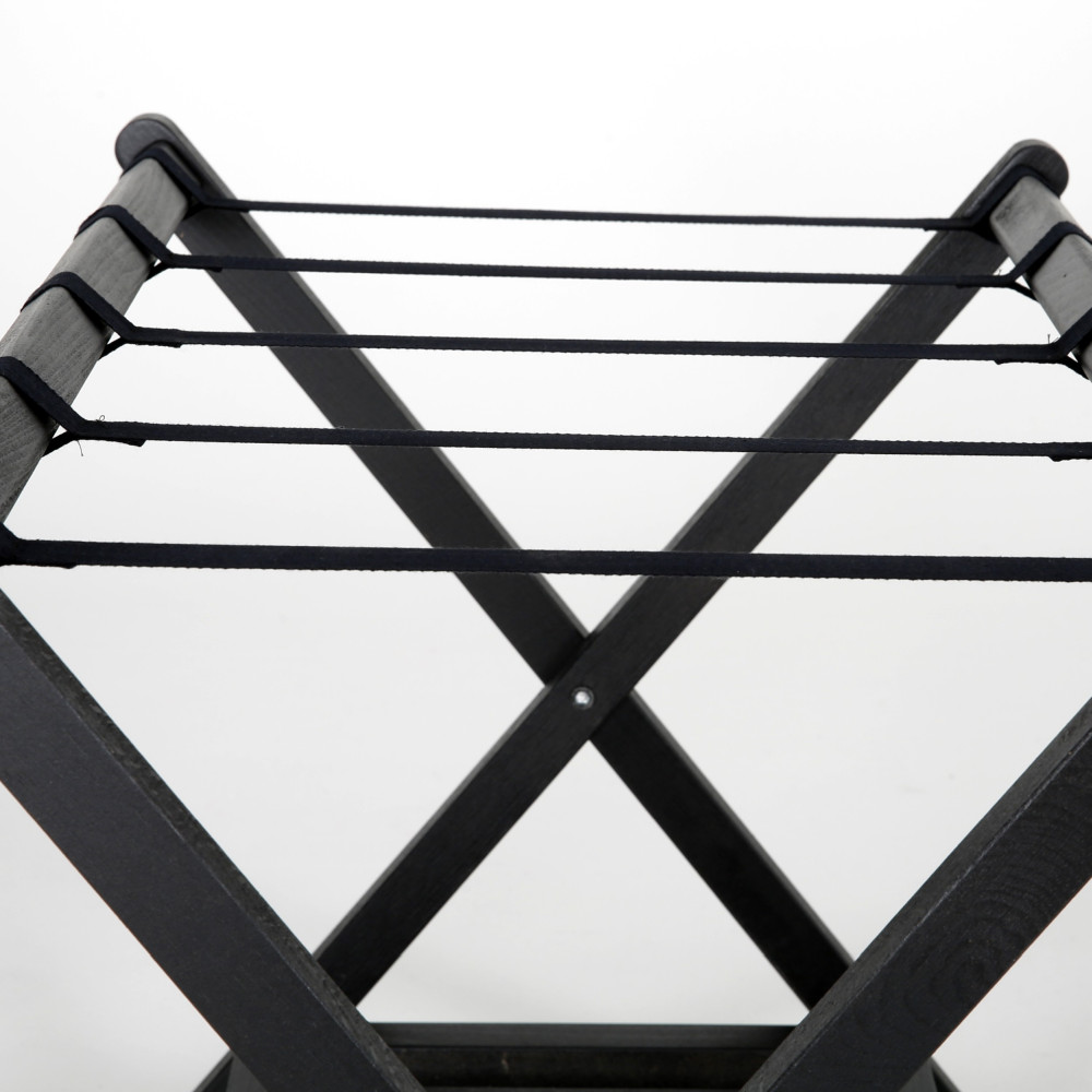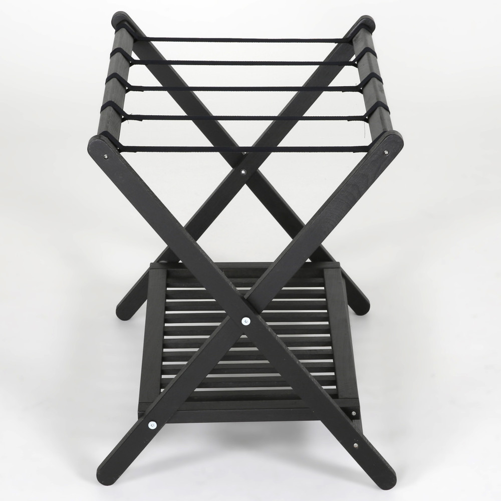Black Beech Wood Folding Luggage Rack with Woolen Straps and Shelf – 18×30 Inch Travel Organizer
