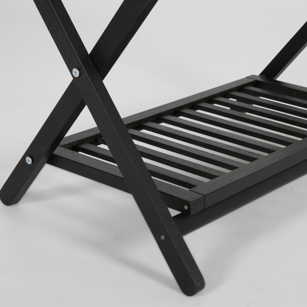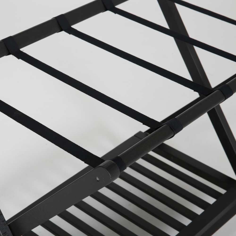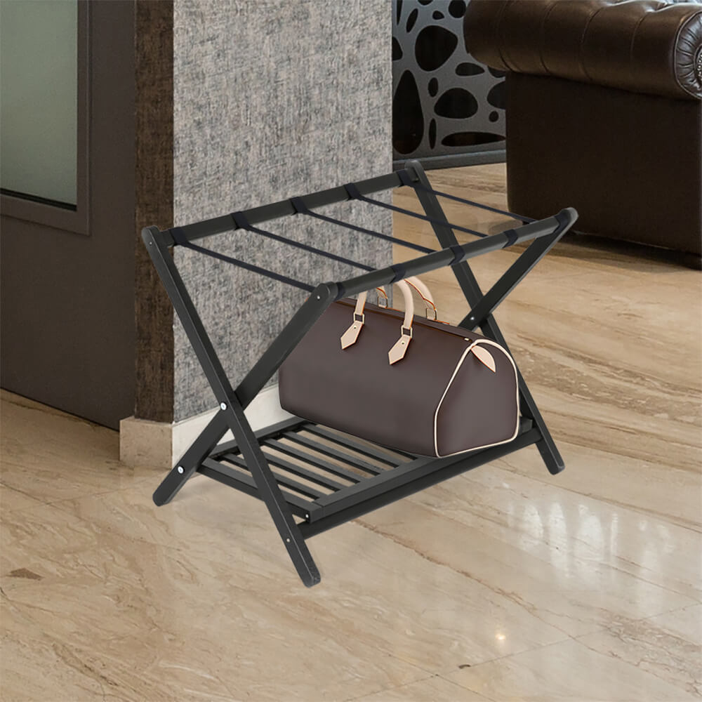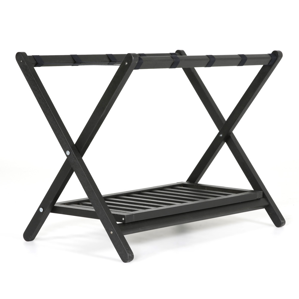 Black Beech Wood Folding Luggage Rack with Woolen Straps and Shelf – 18×30 Inch Travel Organizer