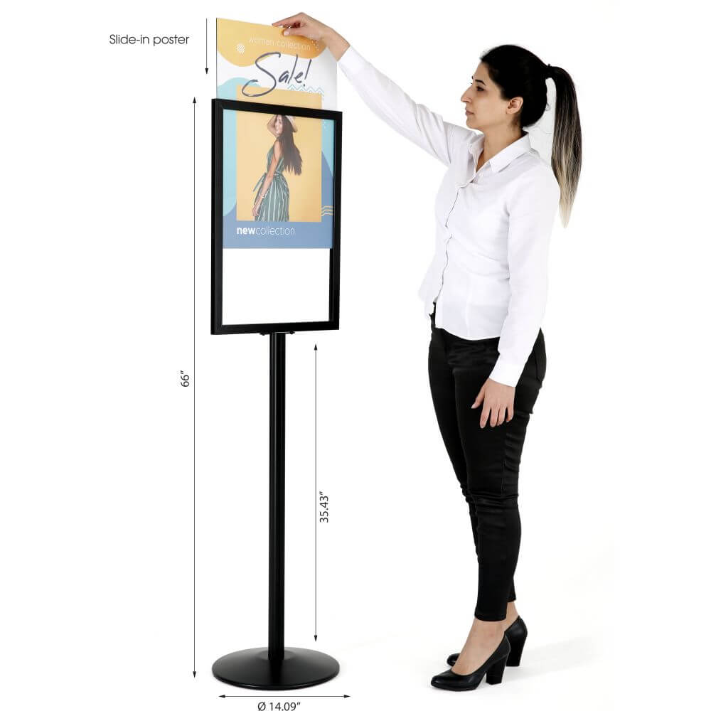 Slide-in Frame with mitered corner lets you feel the edges smoothly and slide load your media from the top, easily with 2 Anti-Glare protective lens PET. Size fits with 22x28 inch or smaller paper media. Professional, modern and sleek design with great durability. Max poster thickness is 0.0688" (1,75mm) when it is used with the protective lens cover. In case a rigid poster is used without protections and a separator, max poster thickness is 0.236" (6mm)It is made of the finest materials while providing the highest level of quality. The aluminum profile makes the product durable yet light for easy carrying. The anodized finish will protect the frame from dust and light scratches. The round heavyweight base with a plastic layer ensures stability, prevents skidding, and protects gloss floors against scratches.Suitable for indoor and outdoor use. This durable marketing stand makes any product advertisement more attractive and stylish. It can be used in portrait (vertical) position. It is a good advertising stand for hotels, travel agents, shows offices conventions, conferences, restaurants, and more. It can be used as a double-sided signpost, sign or poster holder, or advertisement stand.