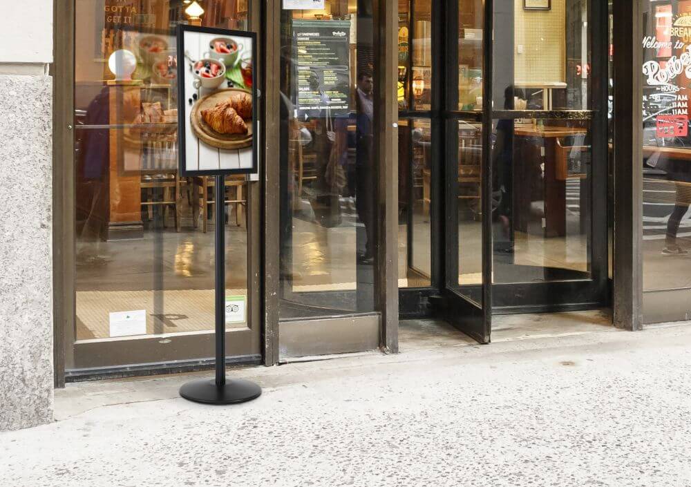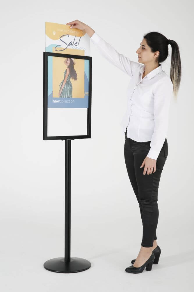 Enhance your advertising strategy with this Floor Standing Sign Holder Stand, an ideal solution for stores and reception areas. Featuring a double-sided frame, this stand allows for back-to-back prints, maximizing visibility and floor space. The dual-sided display ensures your promotional messages reach a wider audience, capturing the attention of customers from all directions. Designed for convenience, the top-loading poster feature allows for easy placement or replacement by a single person. Perfect for retail environments, this sign holder stand is a must-have for effective and efficient advertising.
