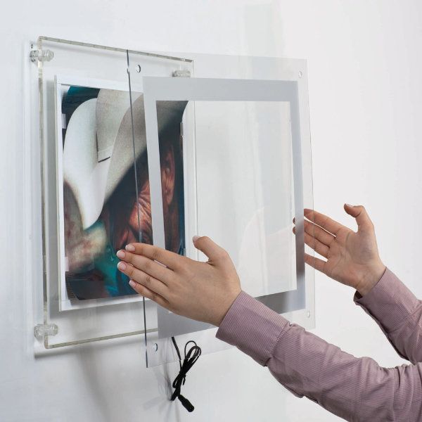 Introducing the ultra-slim, edge-lit acrylic frame, perfect for showcasing your graphics with clarity and style. The Edge-lit AcryLed frame is available in a variety of graphic sizes, including the popular 11×17 inch option. This innovative frame design features a printed graphic securely placed between a specially treated acrylic sheet and a cover acrylic sheet, held in position by two clear clips on the shorter sides. A sleek black printed cover adds a sophisticated finishing touch, making this frame an ideal choice for modern displays. Enhance your visual presentations with the Edge-lit AcryLed frame, combining elegance and functionality for any setting.