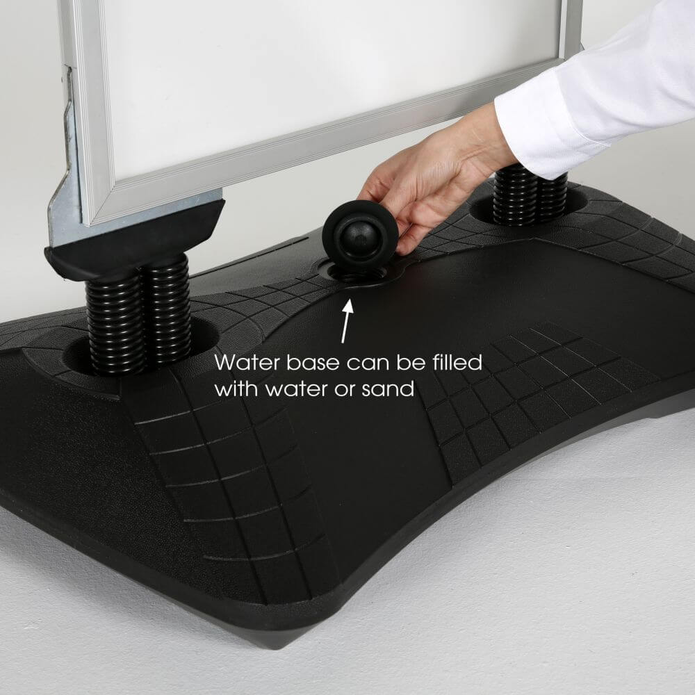 Professional durable water base prevents your signs from tilt over on moderate wind conditions. Round base corners guarantee maximum safety on the pavement. Water base can be filled with water or sand to increase weight and stability.This Sidewalk Pavement Sign is made of the finest materials while providing the highest level of quality. To ensure the sustainability of the quality, the Frame is aluminum and powder coated. Water Base is made of durable HDPE (High-Density Polyethylene) material.This pavement sidewalk sign can be used indoor or outdoor. Excellent way to get attention when you want to display marketing advertisements, restaurant menu, promotions, important messages or any personal notes. It can be used in a multipurpose setting, whether this may be at your place of business, office, outdoors, markets, cafes, events like convention, wedding, birthday, party or more.