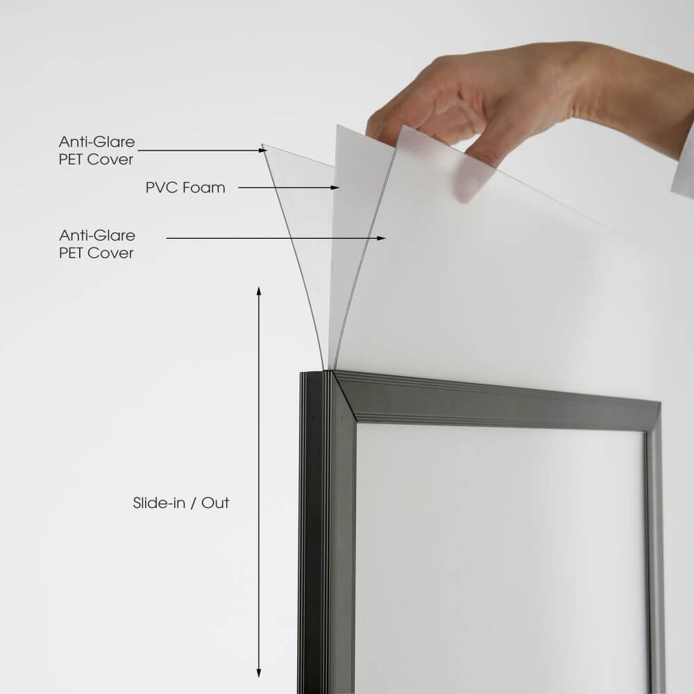 Enhance your display with our Slide-in Frame featuring Safe Corners, designed for a seamless and secure experience. This frame allows you to effortlessly slide your media in from the top, ensuring a smooth interaction with its carefully crafted edges. Equipped with two Anti-Glare protective PET lenses, it provides optimal visibility while safeguarding your content.
