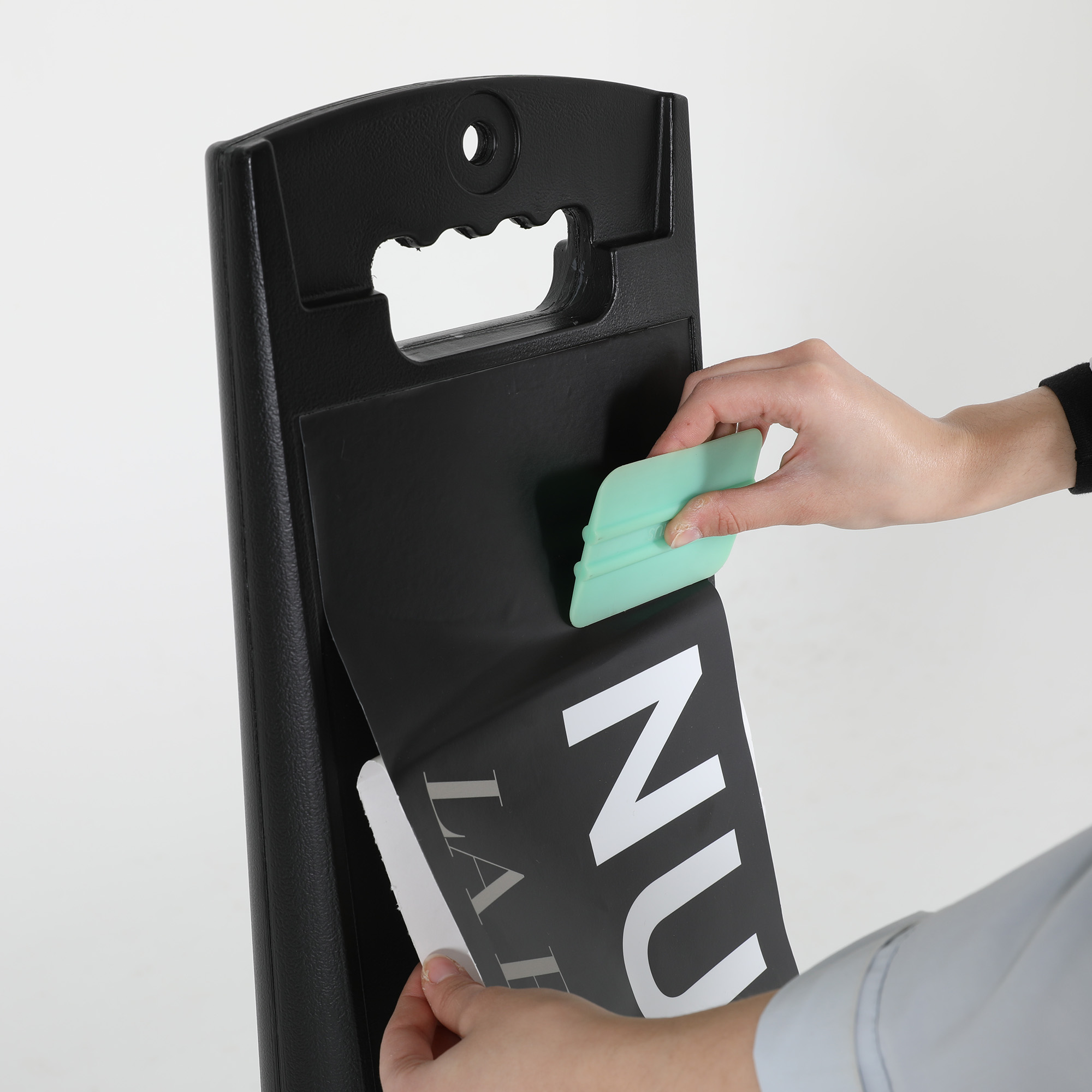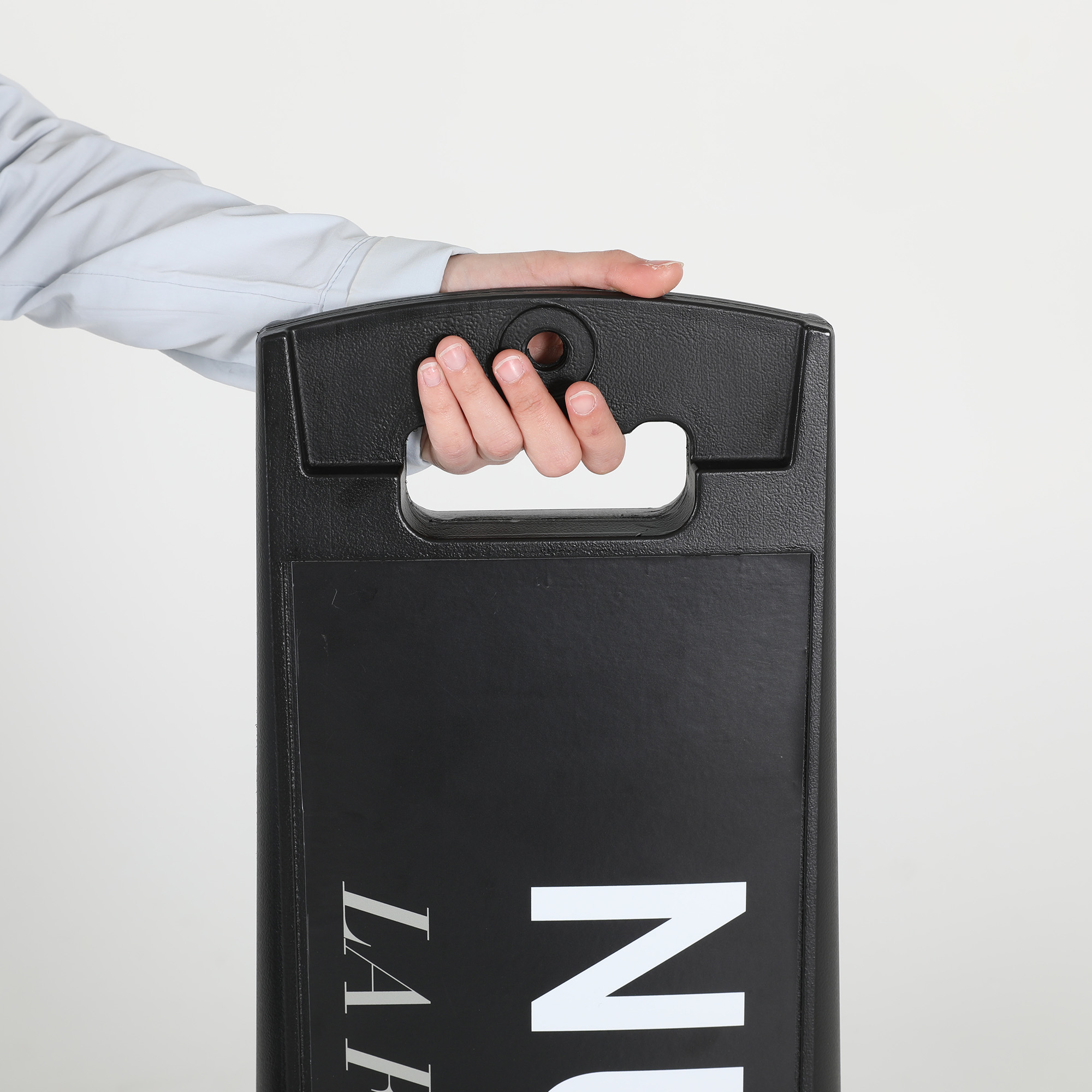 This vertical City Sign features an 8″x36″ recessed display area on both sides, perfect for self-adhesive vinyl posters. Its space-saving design provides maximum visibility in narrow areas such as shop entrances, small parking lots, and busy pavements. Built with a heavy-duty, weather-resistant High-Density Polyethylene (HDPE) body that won’t rust, splinter, or discolor. Designed for maintenance-free, long-term outdoor use, it remains durable even in harsh environmental conditions. Includes a heavy-duty recycled PVC base that slides easily onto the body for immediate stability. The 13.2 lbs (6 kg) weighted base, combined with a heavy flange design and reinforced side walls, prevents the sign from overturning in standard traffic areas.