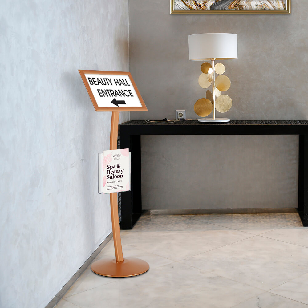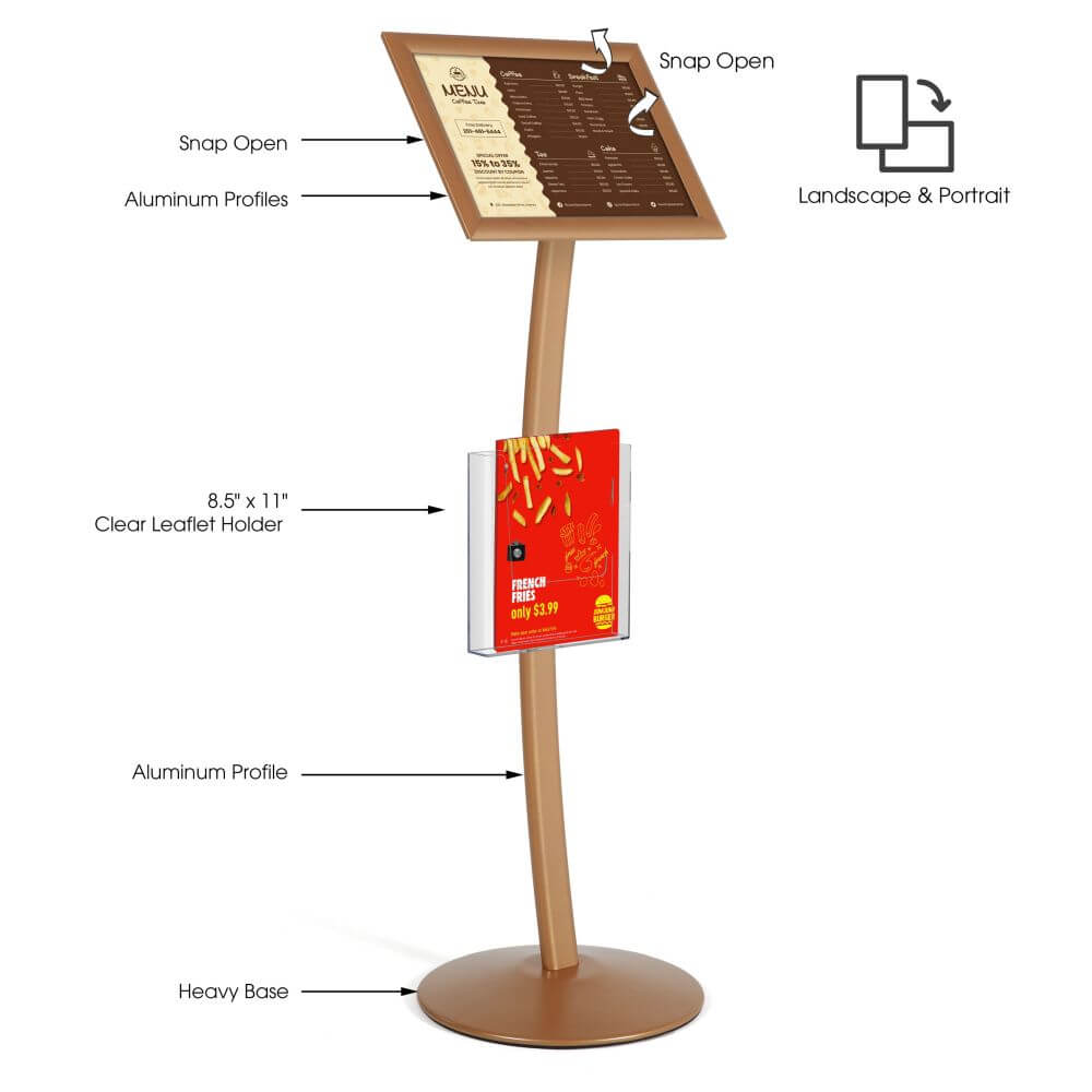Copper Floor Standing Pedestal Sign Holder with Clear Brochure Holder and Menu Board, 11×17 Inch