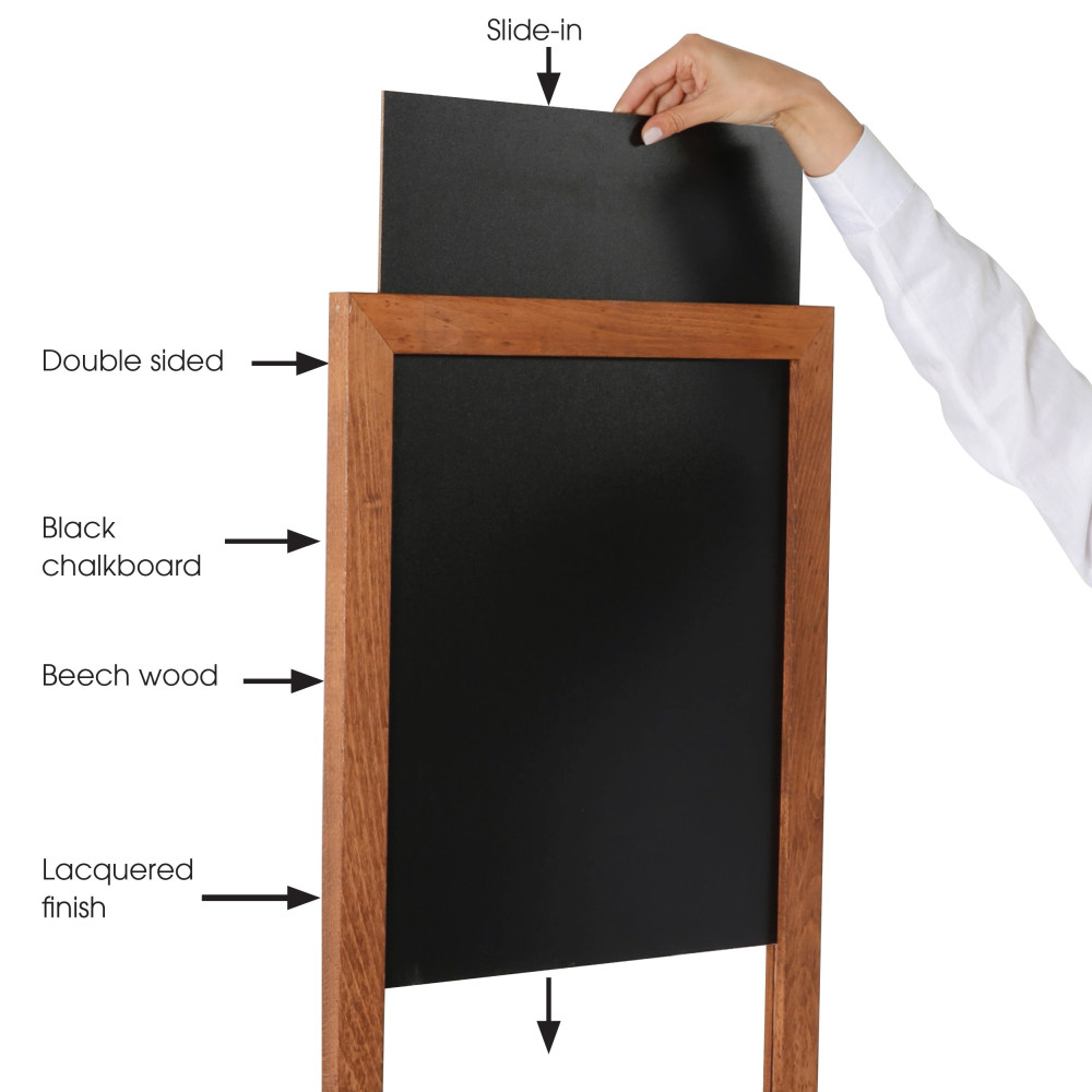 Premium grade stain-free double-sided chalkboard. Easy to clean, hard to scratch, ideal for regular and liquid chalk markers. You can stick poster, menu, sign with regular magnets to the chalkboard's surface.This A Board and Chalkboard is made of the finest materials while providing the highest level of quality. To ensure the sustainability of the quality, the frame is lacquered finish which is resistant to the spill of food and fizzy drinks. Frame made of wood. Because of the natural differences in wood, no two items will look the same. Each item is designed from the same type of wood, but each will have its unique appearance and wood-grain.Suitable for indoor use. It can be used portrait or landscape (vertical or horizontal). Excellent way to get attention when you want to display marketing advertisements, restaurant menu, promotions, important messages or any personal notes. It can be used in a multipurpose setting, whether this may be at your place of business, office, outdoors, markets, cafes, events like convention, wedding, birthday, party or even in your home.