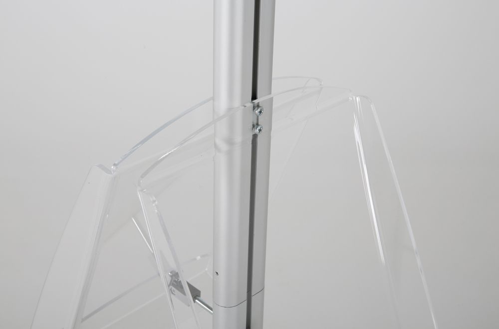 Introducing the perfect brochure stand for versatile indoor use, designed to accommodate various models. This stand features adjustable frames and shelves that can be securely attached to the central pole, either individually or collectively, offering flexibility and convenience. With a height of 57.5 inches, this brochure stand is ideal for showcasing promotional materials in offices, trade shows, and retail environments. Its sleek and sturdy design ensures stability and durability, making it an essential addition to your marketing toolkit. Enhance your display setup with this user-friendly and efficient brochure stand.