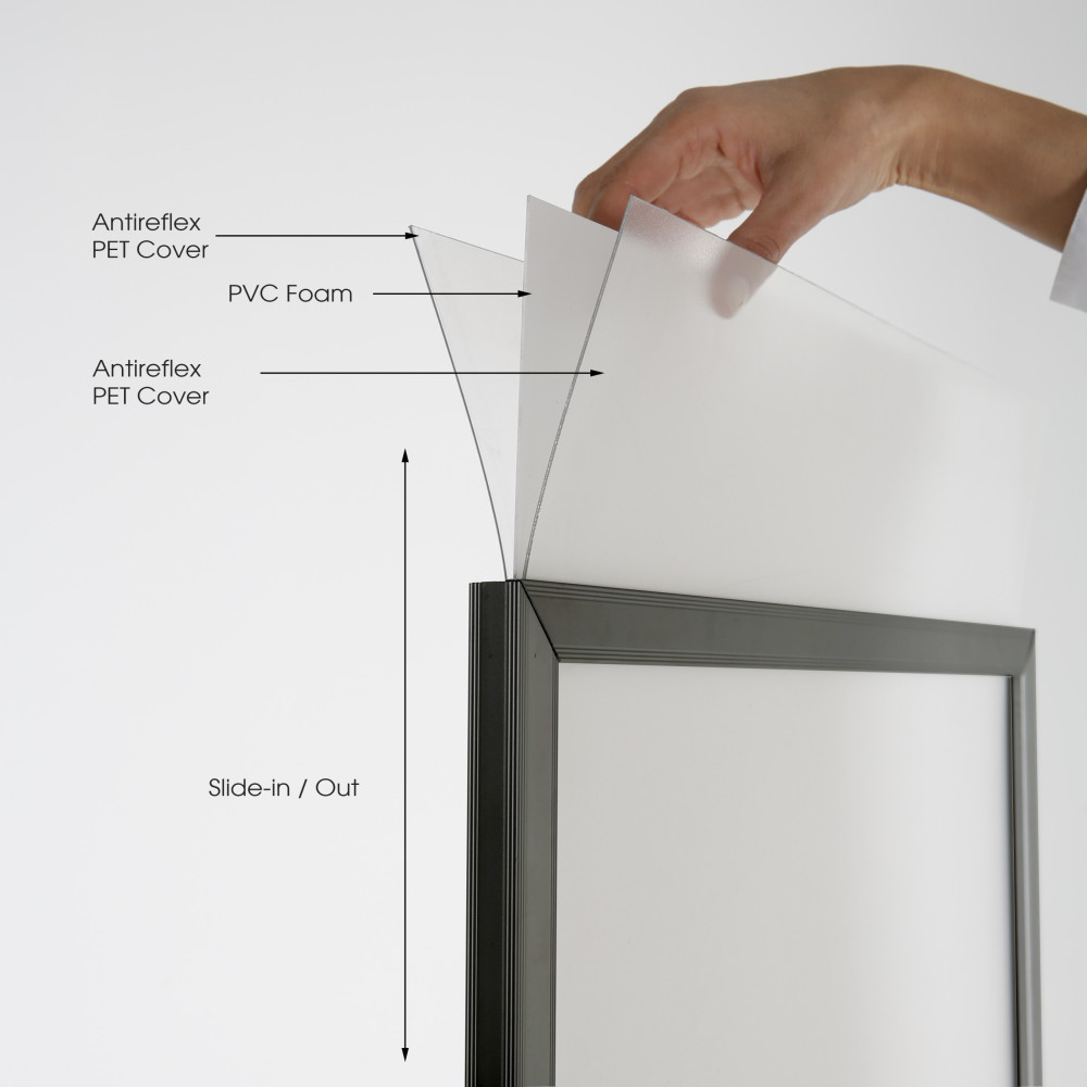 Introducing our Slide-In Frame with Safe Corners, designed to provide a seamless and secure display experience. This frame allows you to effortlessly slide your media in from the top, ensuring a smooth interaction with its carefully crafted edges. Equipped with two anti-glare protective PET lenses, it offers optimal visibility while safeguarding your content.Perfectly accommodating paper media up to 22x60 inches, this frame is ideal for showcasing posters, artwork, or promotional materials. Its professional, modern, and sleek design not only enhances the aesthetic appeal but also ensures exceptional durability for long-term use.The frame supports a maximum poster thickness of 0.0688 inches (1.75mm) when used with the protective lens cover. For more rigid posters, without the use of protective covers or separators, it can accommodate up to 0.236 inches (6mm) in thickness. This versatile and robust frame is the perfect solution for all your display needs, combining style and functionality in one elegant package.