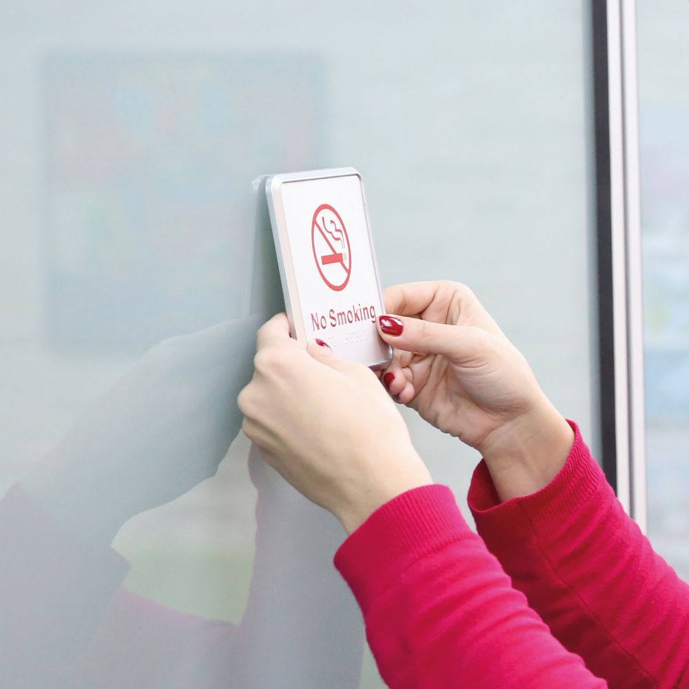 Enhance the visibility of your no-smoking policy with our Braille No Smoking Sign, designed to effectively catch the attention of smokers in your home, office, or business. This sign not only communicates the no-smoking message clearly but also ensures accessibility with Braille for the visually impaired. The sign is easy to install on any door or wall, thanks to the self-adhesive tape provided on the back. Simply peel off the backing and stick it to a clean surface for a secure application. Ensure the surface is clean before applying the double-sided tape for optimal adhesion. This durable and easy-to-read sign is an essential addition to any smoke-free environment, promoting health and safety for all.
