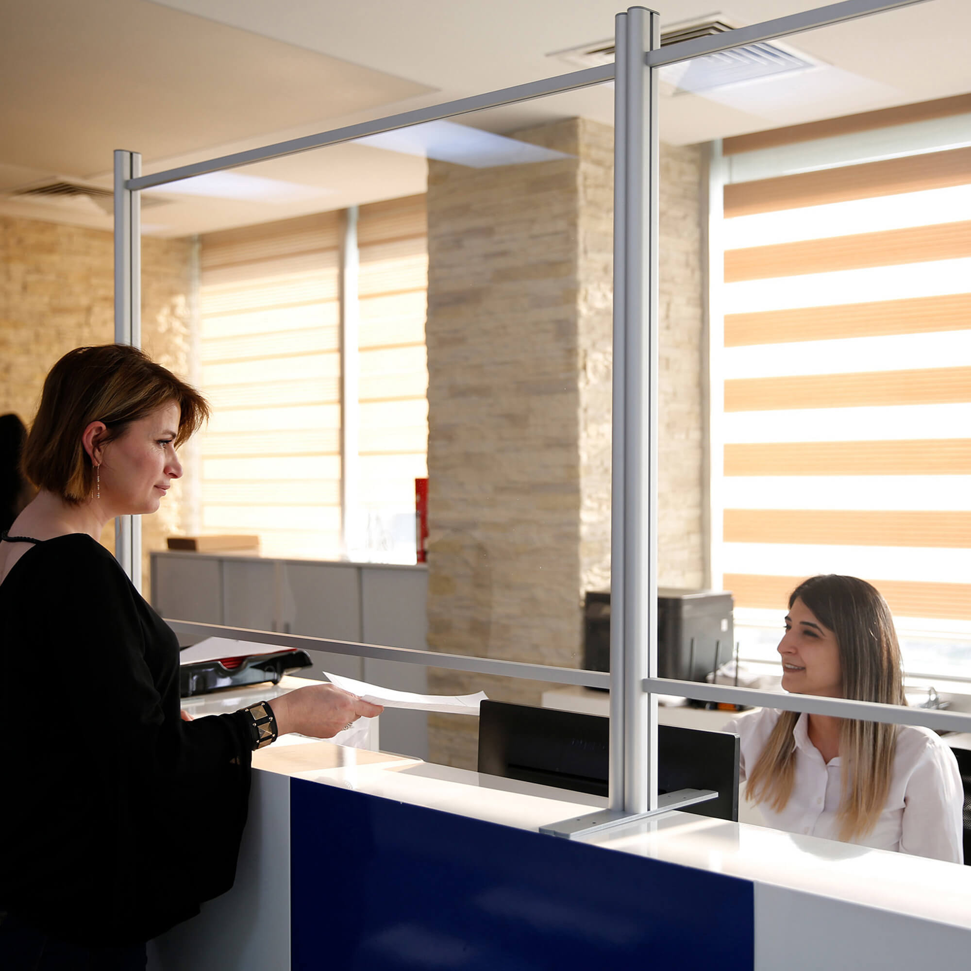 Enhance your safety measures with the M&T Displays Adjustable Clear Barrier, designed to maintain a safe distance between you and your customers or colleagues. This versatile clear panel features an easily adjustable height, allowing you to slide it smoothly within the vertical profiles to suit your specific needs. Ideal for offices, retail spaces, and customer service areas, this transparent barrier provides an unobtrusive yet effective solution for social distancing. Ensure a safer environment with this durable and user-friendly clear barrier.