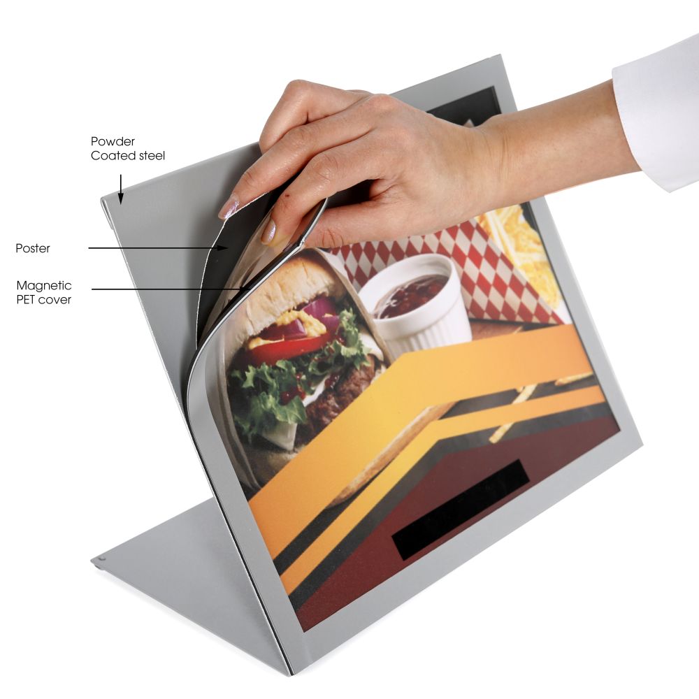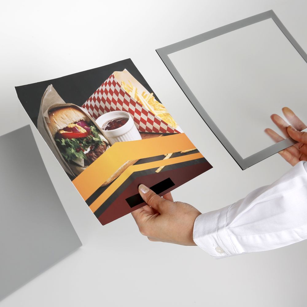 Enhance your menu presentation with our innovative magnetic cover, designed for easy front-loading to prevent tampering and ensure quick content updates. This protective cover shields your menus from common hazards such as dust, food spills, and fizzy drink splashes, keeping them pristine and professional. The landscape orientation is perfect for 11×8.5 inch or smaller displays, making it an ideal choice for any dining establishment. Enjoy the convenience of effortless cleaning and rapid menu changes with this durable and stylish solution.