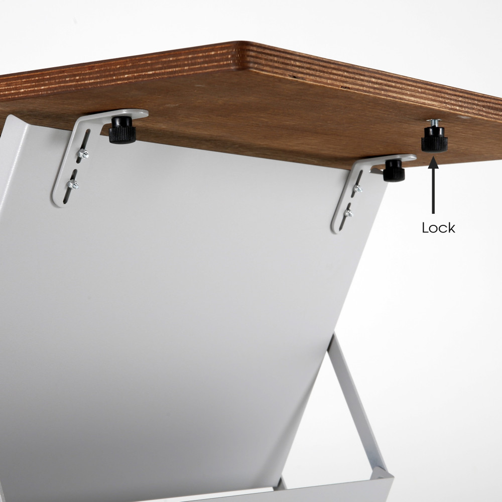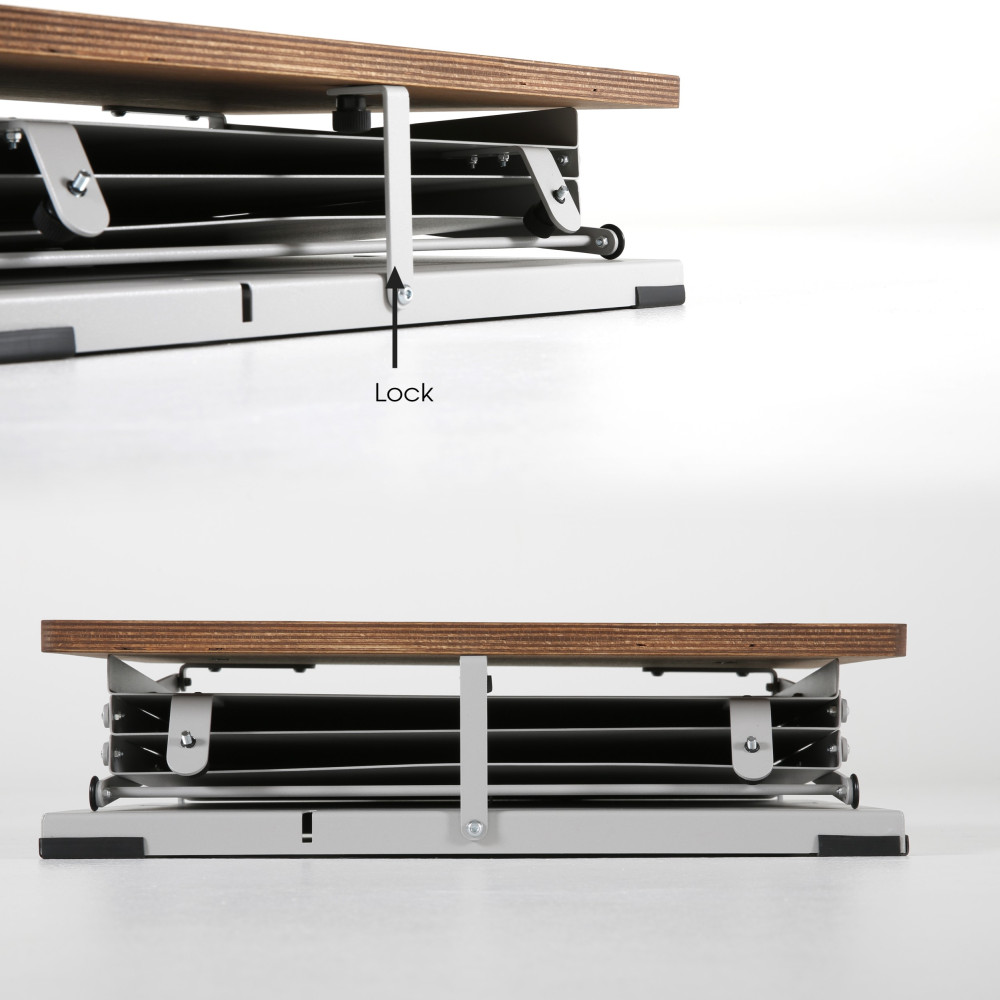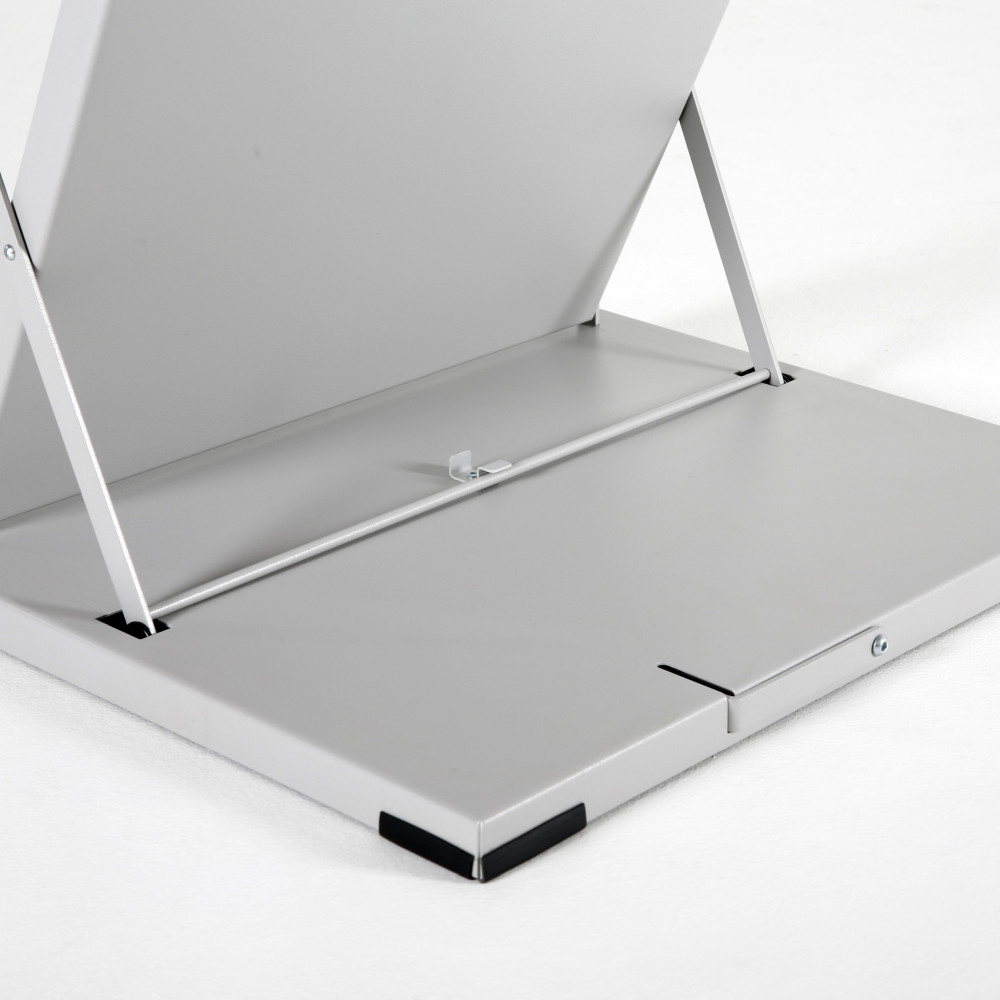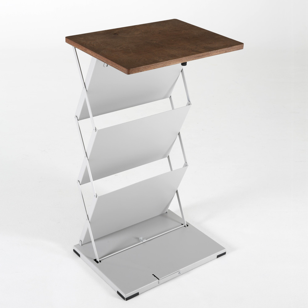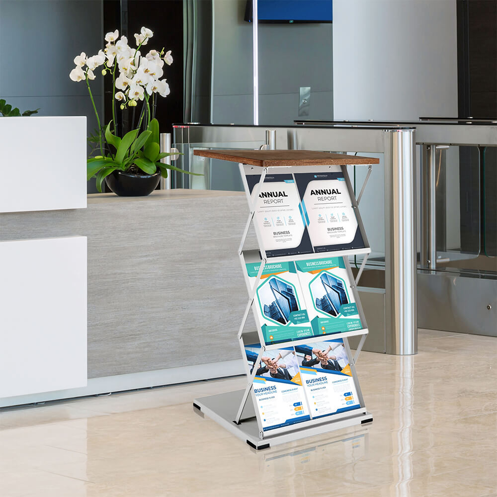 Foldable Wood Counter is compact and easy to carry. The locking system ensures safe use. It folds flat for easy transportation with the provided special bag.LIGHT and Steel body and racks are Powder-coated. Hard Plywood top ensures durability without sacrificing lightness. Top part is made of plywood. Because of the natural differences in wood, no two items will look the same. Each item is designed from the same type of wood, but each will have its unique appearance and wood-grain.Suitable for indoor usage. It can be used as a literature holder, magazine rack, brochure display stand, catalog, leaflet, flier holder for fairs, shows, conferences, conventions, meetings, offices and showrooms.