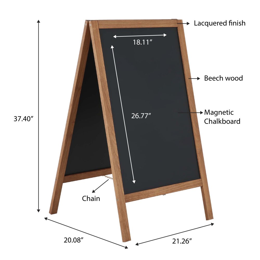 Rustic style, made of wood. This mini A-Board is a light and affordable solution for restaurants, retail stores, and any commercial environment. Premium grade stain-free Magnetic chalkboard. Double-sided, easy to clean, hard to scratch, ideal for regular and liquid chalk markers. You can stick poster, menu, sign with regular magnets to the chalkboard's surface.It is made of the finest materials while providing the highest level of quality. The chain under the A Board and reduces tension on the hinges. To ensure the sustainability of the quality, The lacquered finish which is resistant to the spill of food and fizzy drinks. This item is made of wood. Because of the natural differences in wood, no two items will look the same. Each item is designed from the same type of wood, but each will have its unique appearance and wood-grain.Suitable for indoor usage. Excellent way to get attention when you want to display marketing advertisements, restaurant menu, promotions, signs or important messages. It can be used in a multipurpose setting, whether this may be at your place of business, office, outdoors, markets, cafes, events like convention, wedding, birthday, party, or as a memo board in your home.