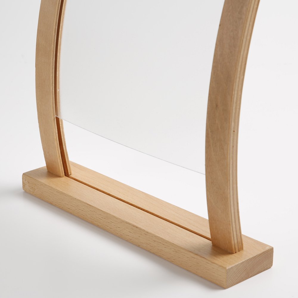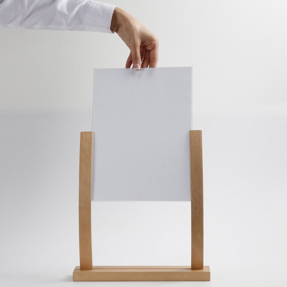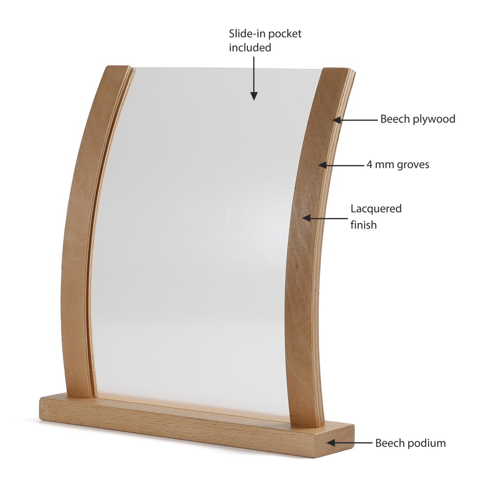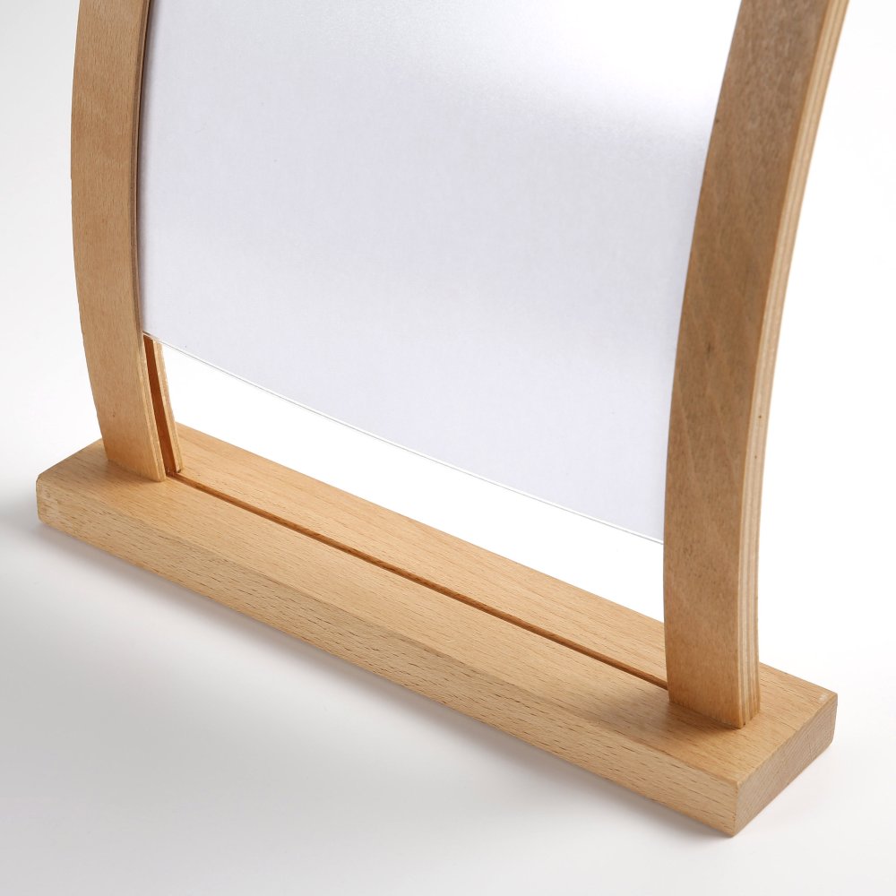 Enhance your dining or retail space with our modern-style beech plywood menu holder, designed for both elegance and affordability. This lightweight menu holder is perfect for restaurants, retail stores, and any commercial environment seeking a touch of sophistication. Featuring a user-friendly design, simply slide your leaflets into the durable PET pocket, then insert the pocket into the grooves of the wooden columns for a secure display. Our curved menu holders are crafted from the finest materials, ensuring exceptional quality and durability. To maintain their pristine condition, each wood menu holder is finished with a lacquer coating, making it resistant to spills from food and fizzy drinks. Elevate your presentation with this sustainable and stylish menu holder solution.