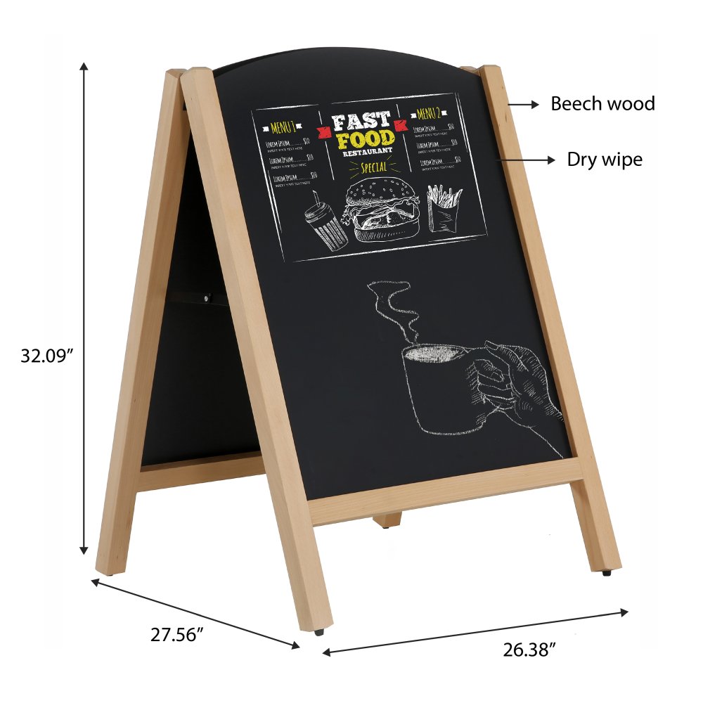 Welcome your guests at your restaurant, birthday party, wedding, or home and business events with creative doodles and writings using our premium sandwich board. This versatile chalkboard is perfect for displaying messages and menus, offering ample space to fit your needs while maintaining a modest presence on sidewalks. Crafted from premium-grade, stain-free black chalkboard material, it ensures a clean and professional look. The top-loading, slide-in design allows for quick and easy menu changes, utilizing both sides of the board for maximum efficiency. Ideal for any occasion, this sandwich board is a must-have for effective and stylish communication.