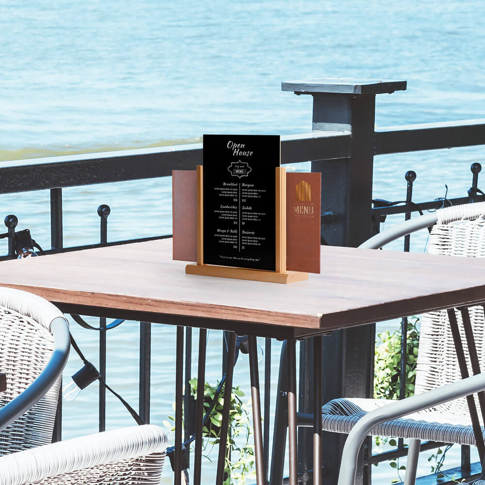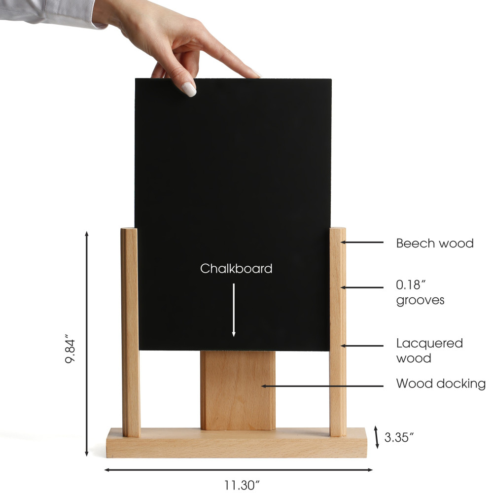 Vintage style, made of beech wood. This menu holder is a light and affordable solution for restaurants, retail stores, and any commercial environment. Simply slide the chalkboard into grooves of the wooden columns. This item is made of wood. Because of the natural differences in wood, no two items will look the same. Each item is designed from the same type of wood, but each will have its unique appearance and wood-grain.This Desktop Menu Holder is made of the finest materials while providing the highest level of quality. Basic and vintage styles offer options to users. To ensure the sustainability of the quality, wood menu holders are lacquered finish which is resistant to the spill of food and fizzy drinks.Excellent way to get attention when you want to display marketing advertisements, restaurant menu, promotions, important messages or any personal notes. These holders can be used in a multipurpose setting, whether this may be at your place of business, office, outdoors, markets, cafes, events like convention, wedding, birthday, party or even in your home.