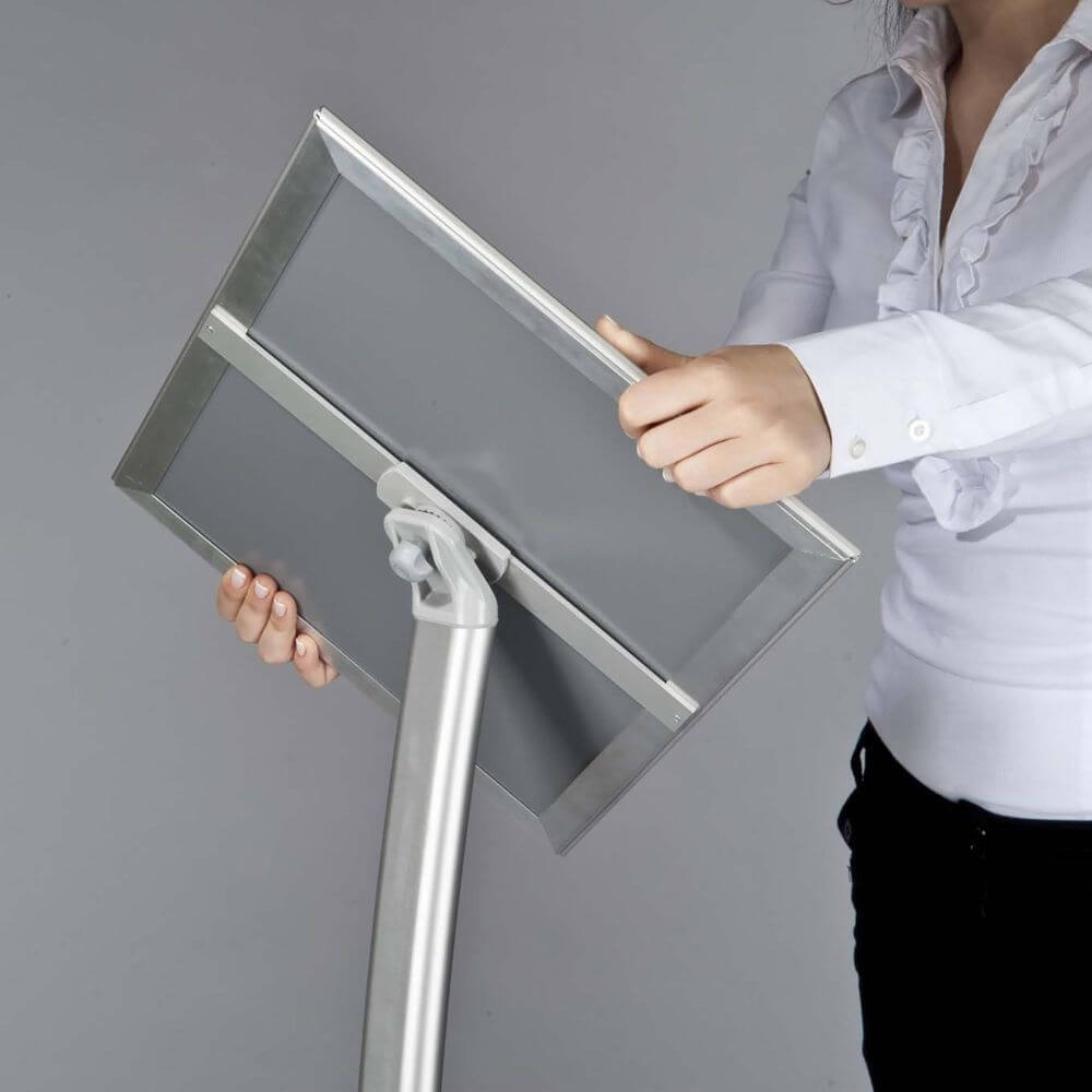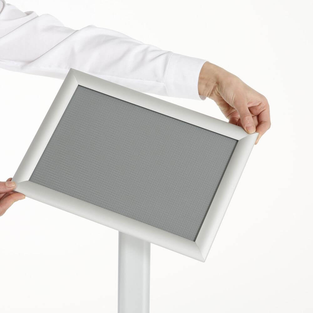 Introducing our innovative Curved Sign Holder, designed to captivate attention in high-traffic areas with its sleek and modern aesthetic. This stylish display features a unique curved design that adds a touch of elegance to any setting. The versatile rotating head allows for seamless transitions between portrait and landscape orientations, enhancing the visibility of your advertisements. Equipped with anti-glare PET covers, this sign holder ensures your media remains protected from direct light and dust, maintaining clarity and longevity. The convenient Snap Frame design enables quick and effortless media changes—simply flip open all four profiles, replace the old media with the anti-glare PET cover, snap the sides shut, and you’re all set. Perfect for businesses looking to make a lasting impression, this Curved Sign Holder is a must-have for effective and stylish advertising.