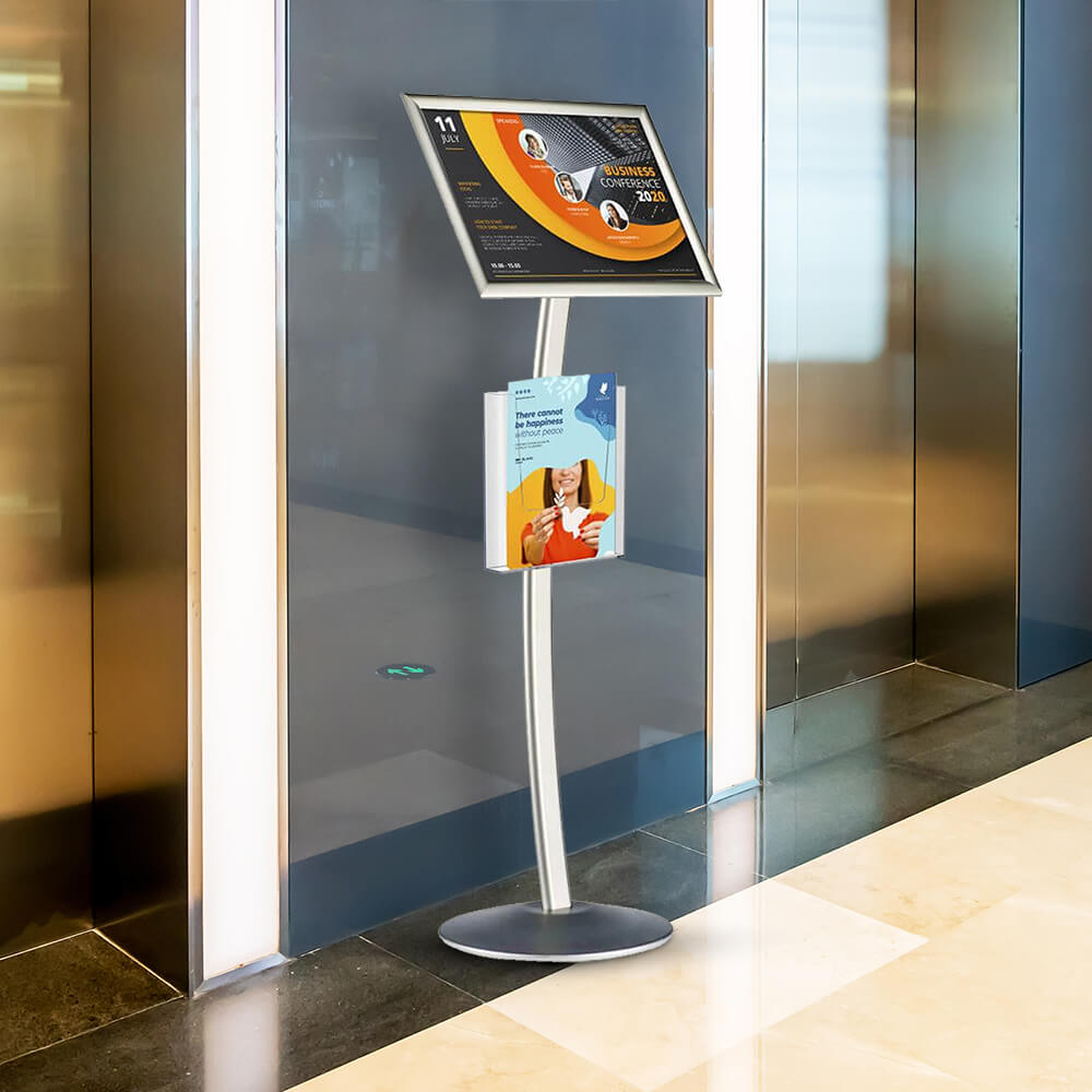 Silver Floor-Standing Pedestal Sign Holder with 11×17 Inch Display and Clear Brochure Holder Menu Board