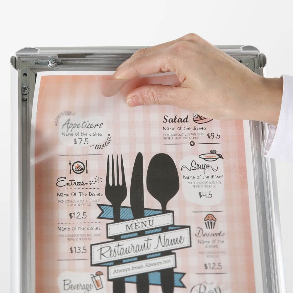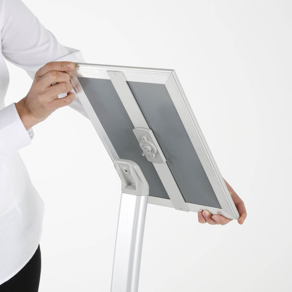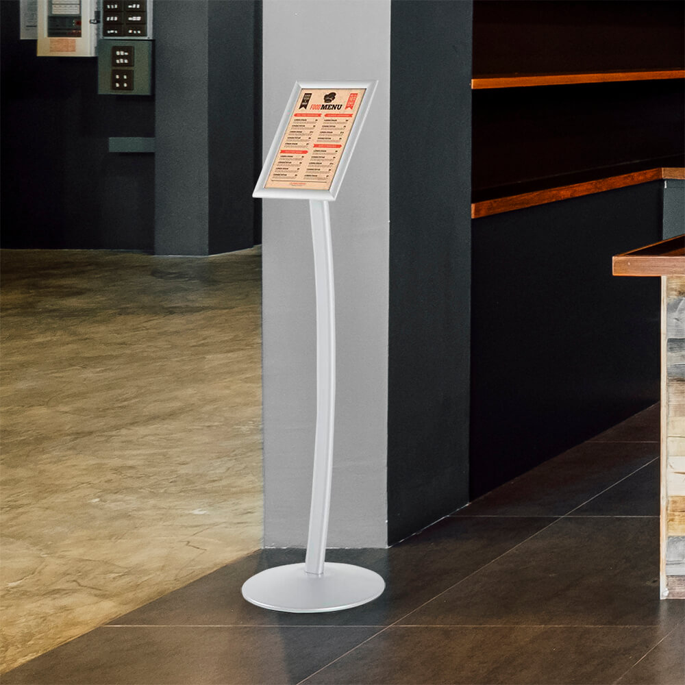 Introducing our innovative Curved Sign Holder, designed to captivate attention in high-traffic areas with its sleek and modern aesthetic. This stylish display features a unique curved design that adds a touch of elegance to any setting. The versatile rotating head allows for seamless transitions between portrait and landscape orientations, enhancing the visibility of your advertisements. Equipped with anti-glare PET covers, this sign holder ensures your media remains protected from direct light and dust, maintaining clarity and longevity. The convenient Snap Frame design enables quick and effortless media changes—simply flip open all four profiles, replace the old media with the anti-glare PET cover, snap the sides shut, and you’re all set. Perfect for businesses looking to make a lasting impression, this Curved Sign Holder is a must-have for effective and stylish advertising.