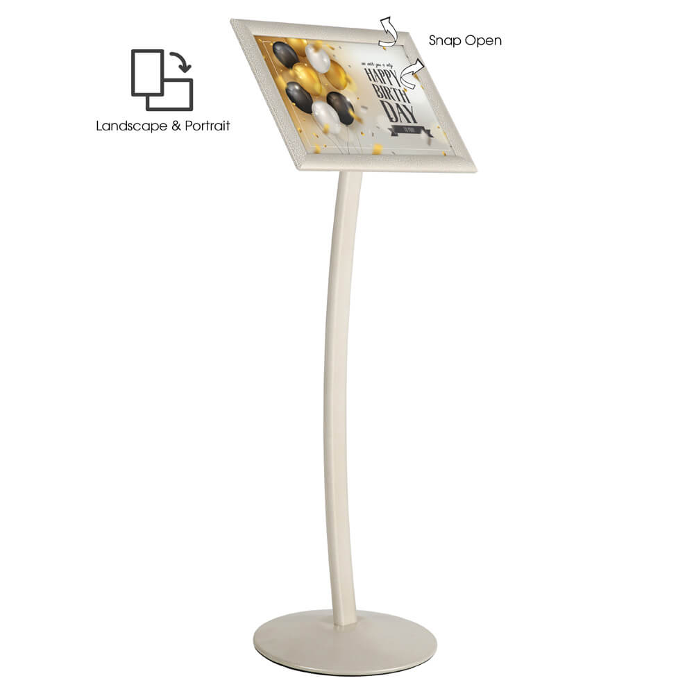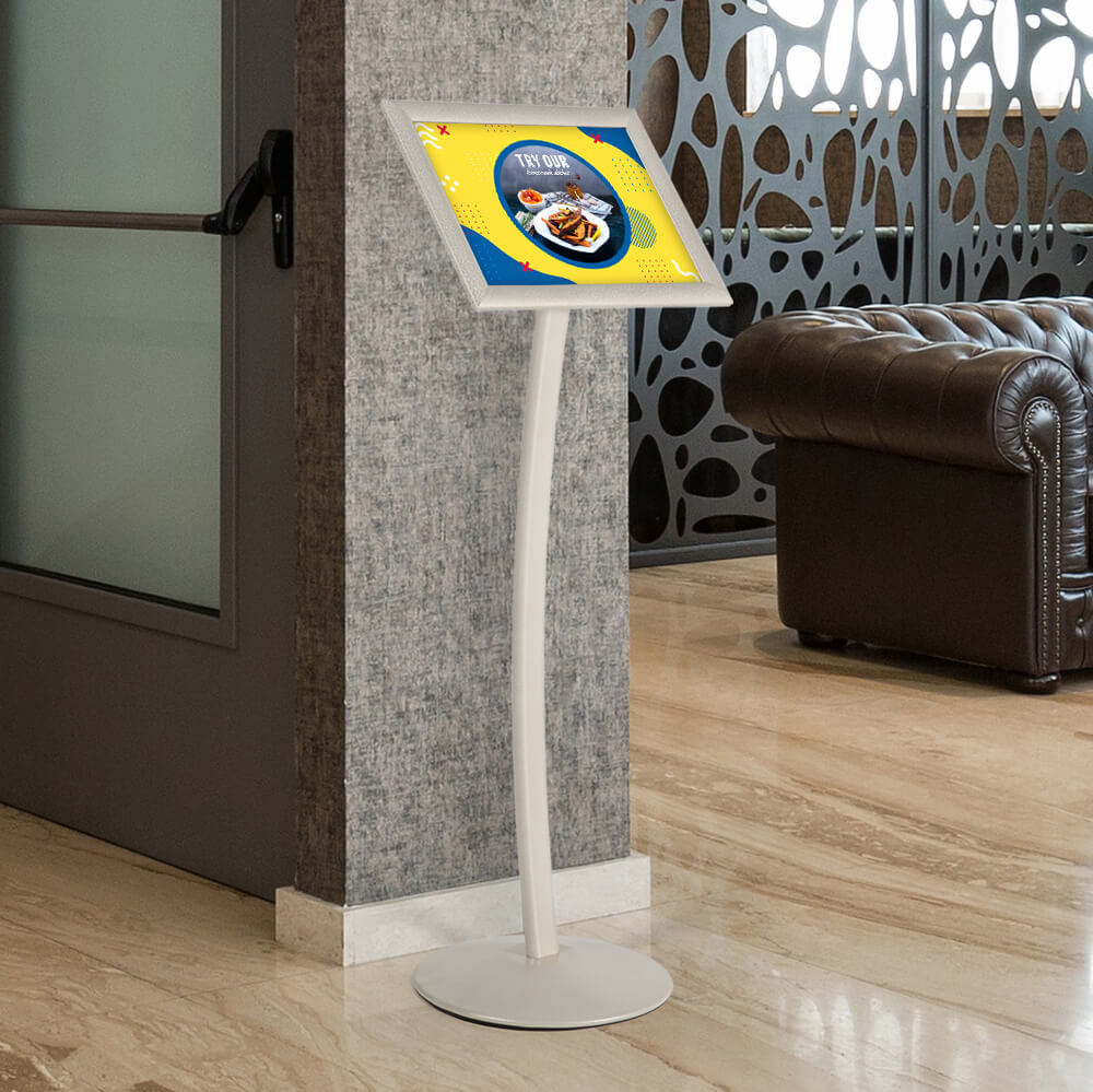 Introducing our innovative Curved Sign Holder, designed to captivate attention in high-traffic areas. This stylish sign holder features a modern and exquisite curved design, perfect for enhancing any display setting. The frame’s adjustable telescoping feature allows you to easily modify the height of your advertisement, ensuring optimal visibility. With a sturdy heavy base, this sign holder guarantees stability, even in bustling environments. Additionally, the anti-glare PET covers protect your media from direct light and dust, maintaining a clear and professional presentation. Ideal for retail spaces, trade shows, and corporate environments, this Curved Sign Holder is a must-have for effective advertising.
