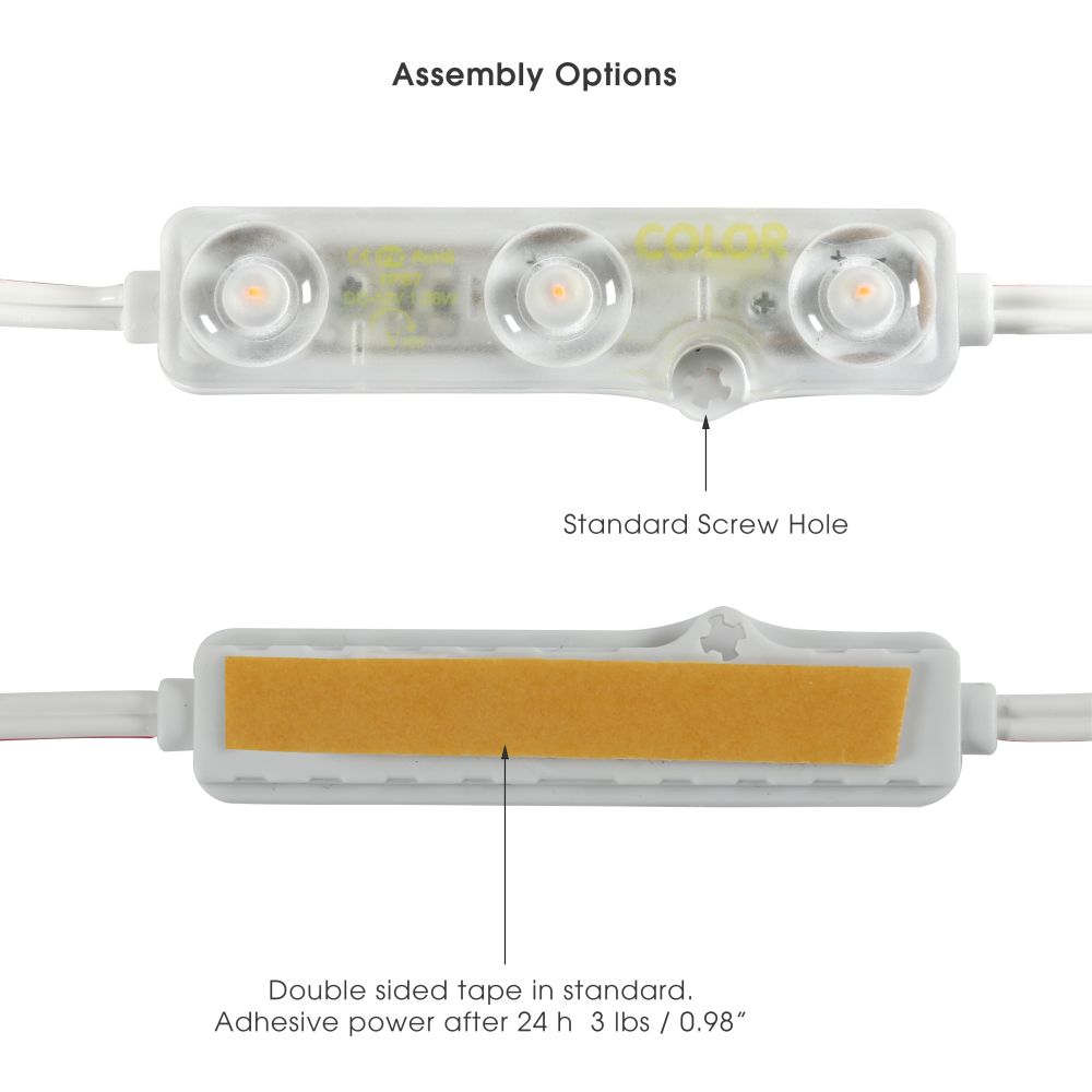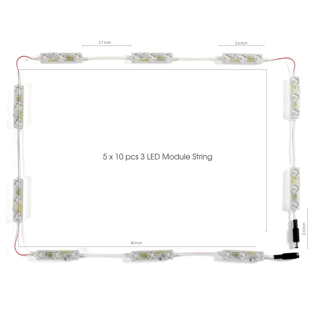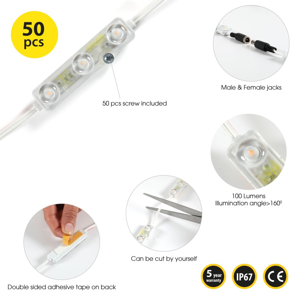 Illuminate your space with our versatile LED Module Pack, featuring a total of 150 high-quality LEDs. Each module is equipped with 3 bright LEDs, and the package includes 5 sets of 10 modules, ensuring ample lighting for any project. Designed for convenience, these modules come with adhesive tape on the back for easy mounting and screws for a more permanent installation. The included 2.1×2.5mm male and 2.5×2.5mm female jacks allow for effortless scalability, making it simple to expand your lighting setup. Assembled as a 21ft (645cm) string from end to end, this product is ready to use straight out of the box with no soldering required. Perfect for both DIY enthusiasts and professional installations, this LED Module Pack is your go-to solution for efficient and effective lighting.